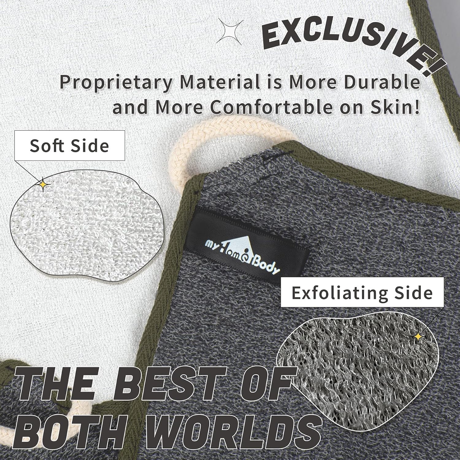 - Proprietary Material is an Exclusive Weave for a Smoother and More Comfortable Feeling on Skin! Soft Layer: 80% Charcoal Fiber, 20% Polyester. Exfoliating Layer: 49% Polyester, 24% Nylon, 27% Charcoal Fiber