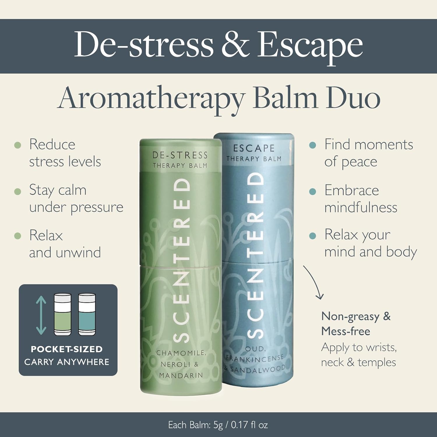 - Premium Essential Oil Blends: 100% Natural – 'De-Stress' blends Chamomile, Neroli, and Mandarin for anti-stress support, while 'Escape' combines Oud, Sandalwood, and Frankincense for calm and clarity. Both balms are in a Shea Butter and beeswax base. Cruelty-free and vegetarian-friendly.