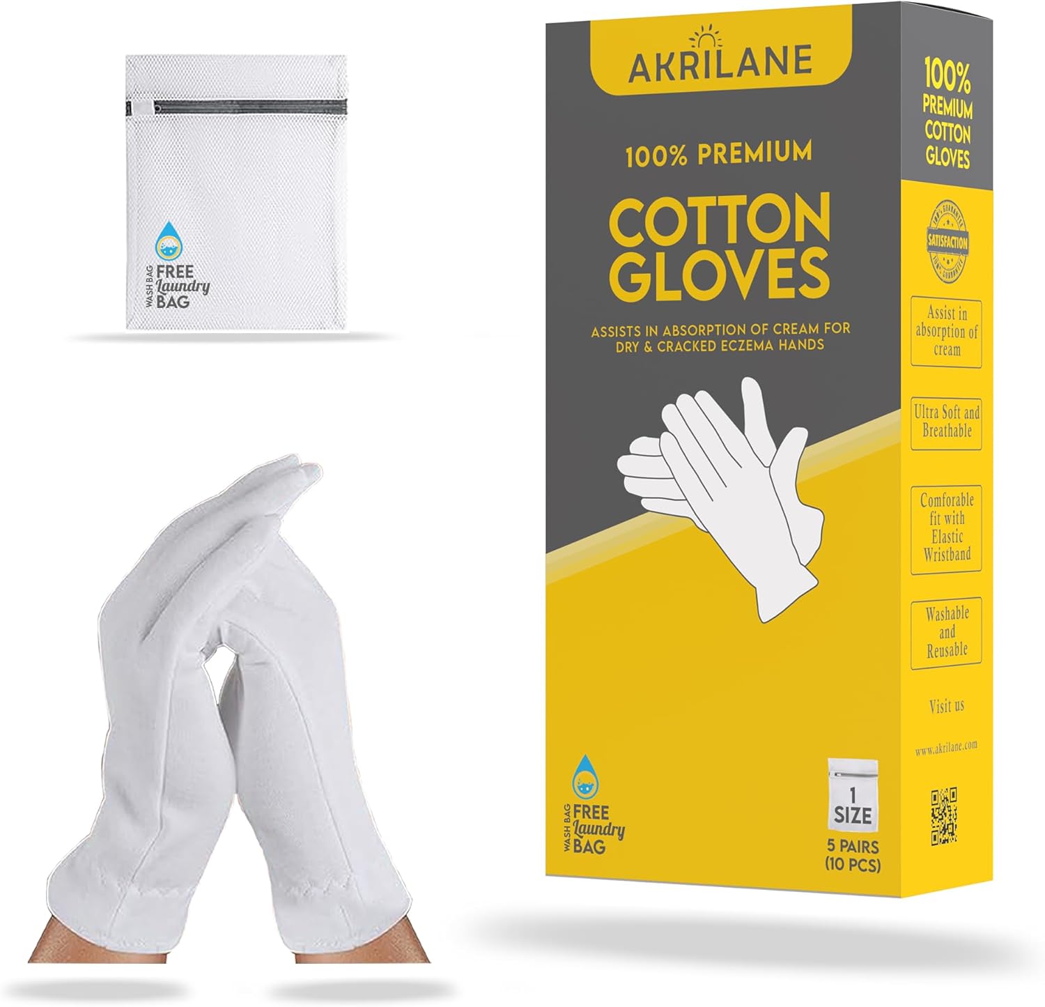 - ✨ ULTIMATE OVERNIGHT TREATMENT - Akrilane's high-quality 100% cotton gloves offer an effective overnight treatment for repairing, hydrating, and softening dry hands. Use them at night or during the day to treat dryness and itchiness, prevent scratching, and keep lotion off sheets while sleeping. They are also helpful for treating eczema. 👍