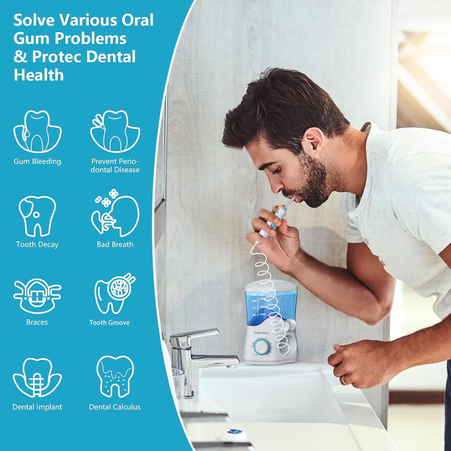 TUREWELL Water Dental Flosser for Teeth/Braces, Water Teeth Cleaner 8 Jet Tips and 10 Pressure Levels, 600ML Large Water Tank Oral Irrigator for Family(White)