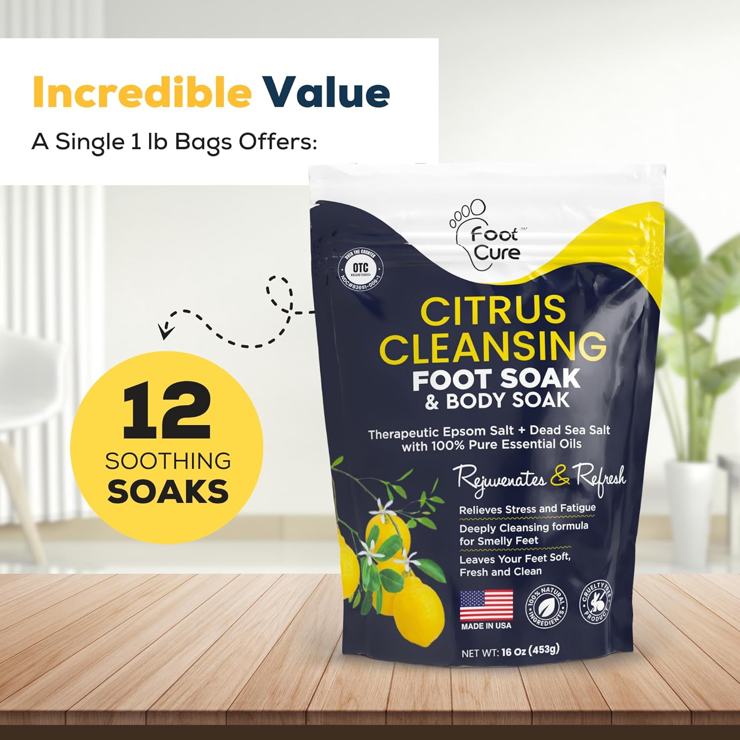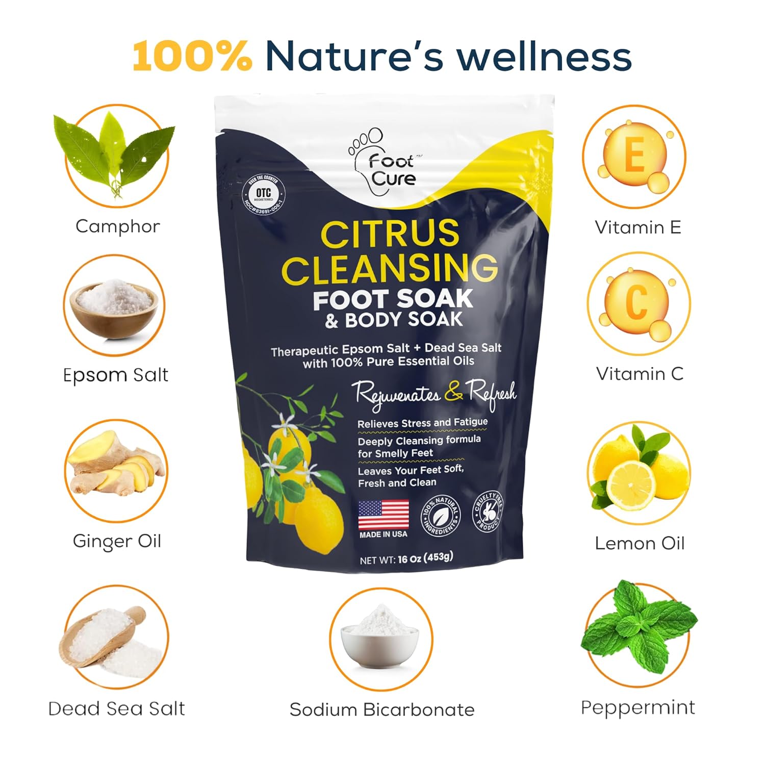 FOOT CURE Citrus Detox Foot Soak with Epsom Salts – for Foot Callus, Damaged Toenail Appearance, Pedicure Spa, and Soothing Sore, Tired Feet - 16 oz (Pack of 1)