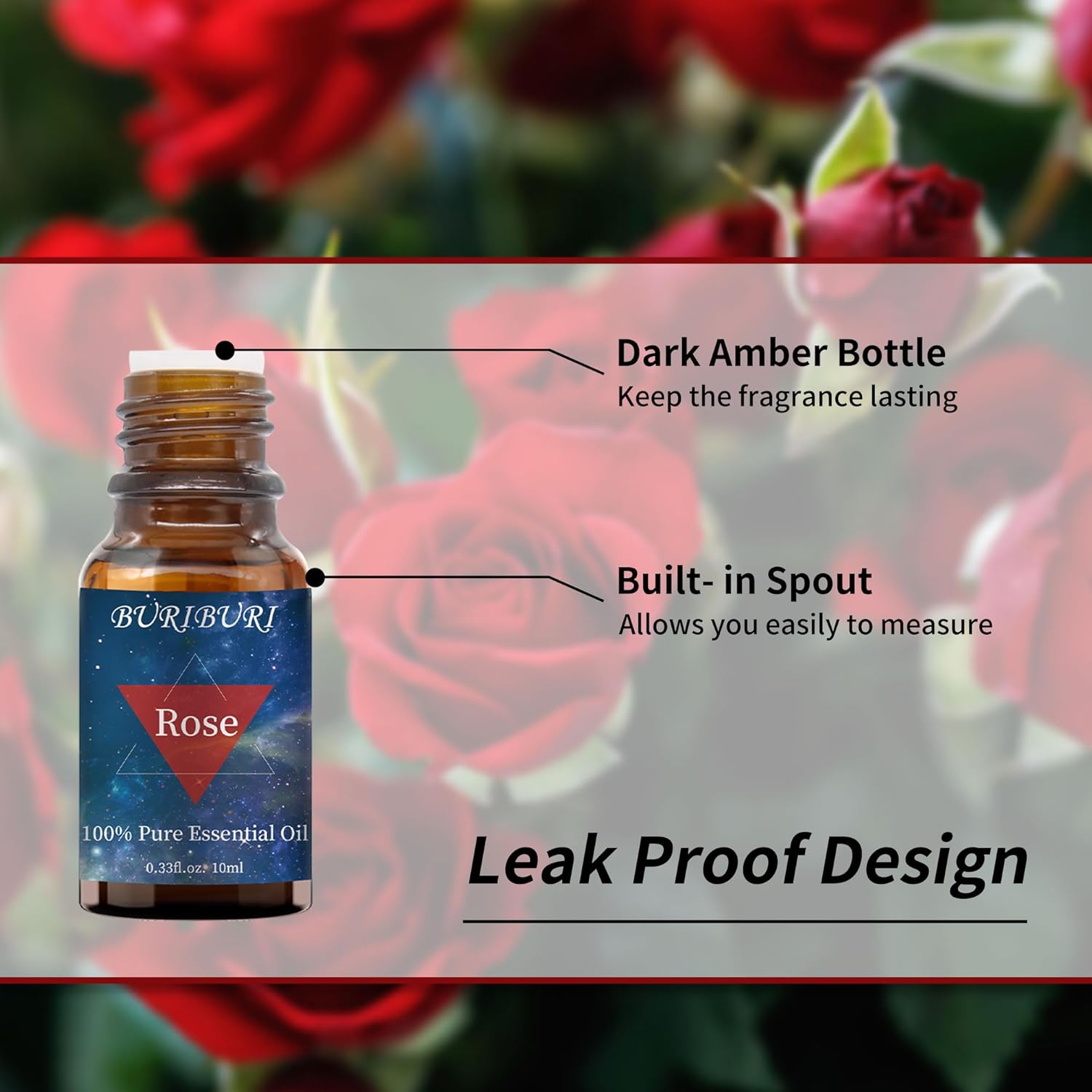 - Packing Includes: 10ml Rose Essential Oil x1, 10ml Sandalwood Essential Oil x1. With no adulterants or dilution, 100% pure quality. BURIBURI scented oil is bottled in a durable amber glass bottle.