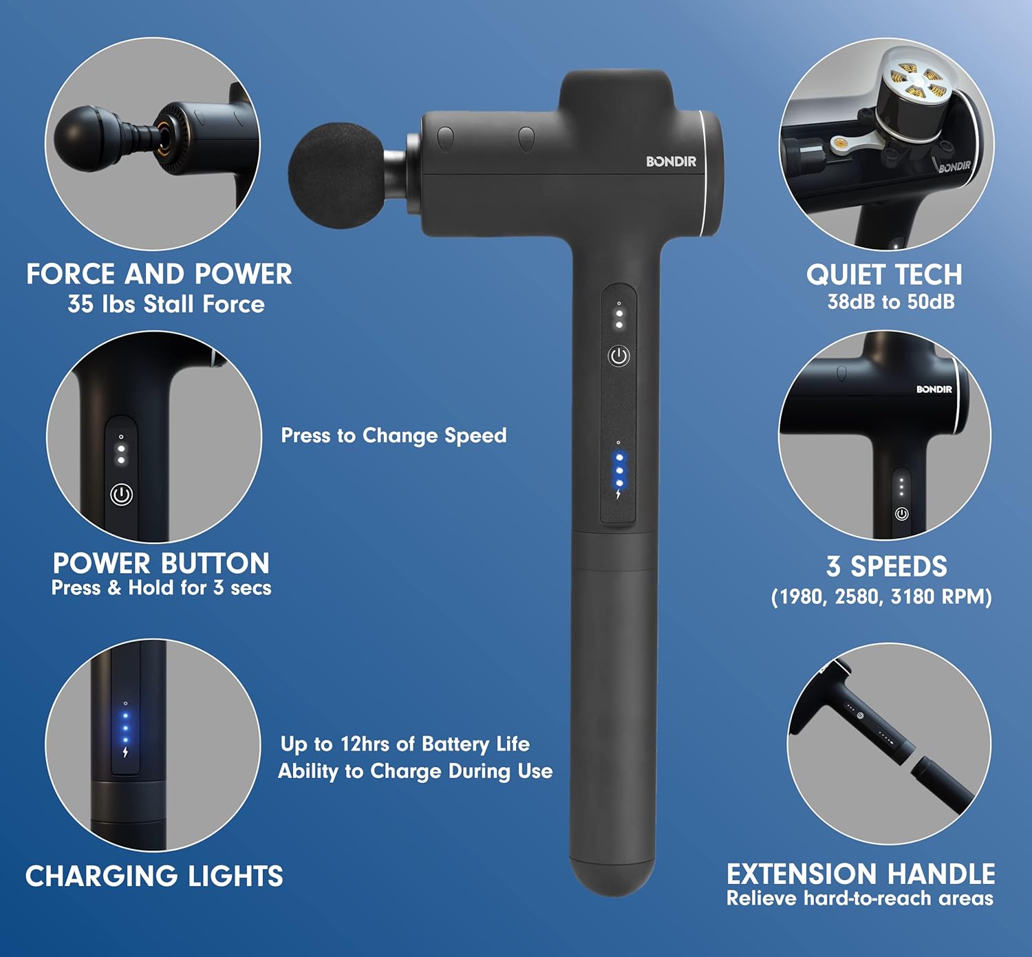 - [Professional Grade] 6 interchangeable attachment heads, Multi-Speed functionality, Handle Extender, Handheld, Cordless, and Rechargeable. For use at home, the gym, on travel, and office. Great for personal use as well as professional physical therapists, chiropractors, personal trainers, athletes