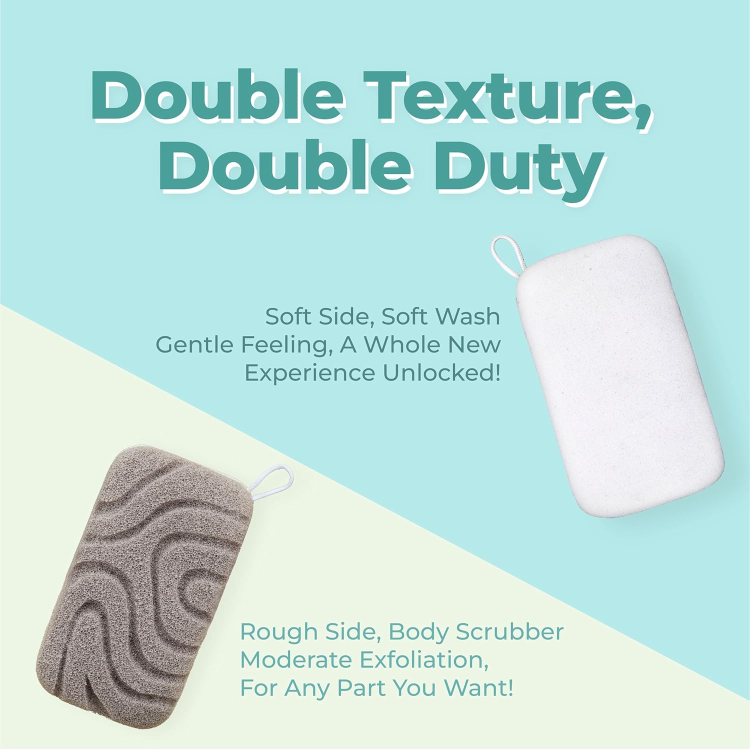 - Double Sided : One bath loofah sponge with two unique sides! White smooth side for cleansing, massaging away impurities. Gray textured side for exfoliation, gently removing dead or dry flaky skin cell.