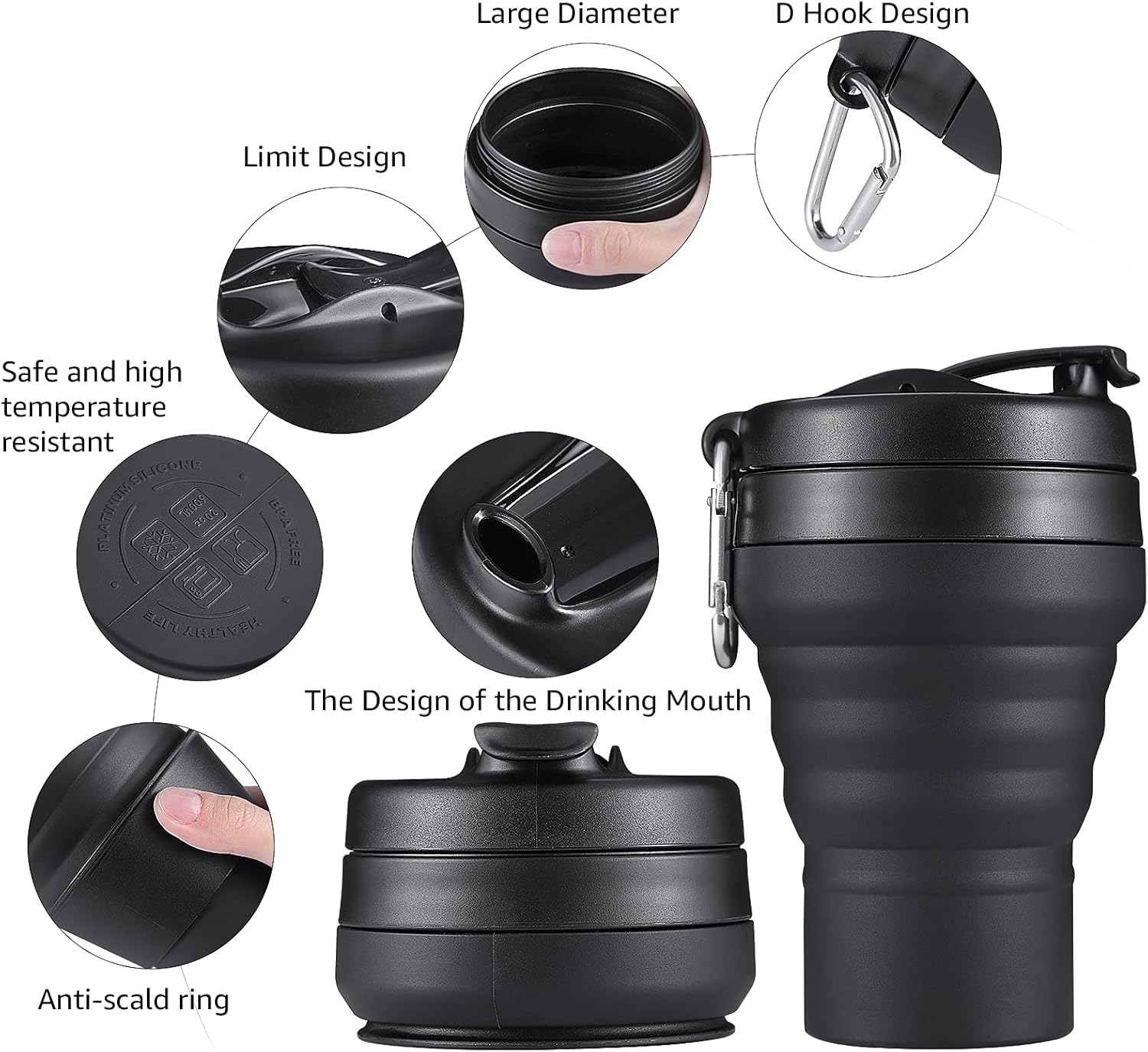 Collapsible Cup for Traveling, 20 OZ 600ml Large Silicone Folding Camping Mug, Leak Proof BPA Free Portable Reusable Bottle for Coffee, Tea, Water, Camping, Hiking, Outdoor (Black)