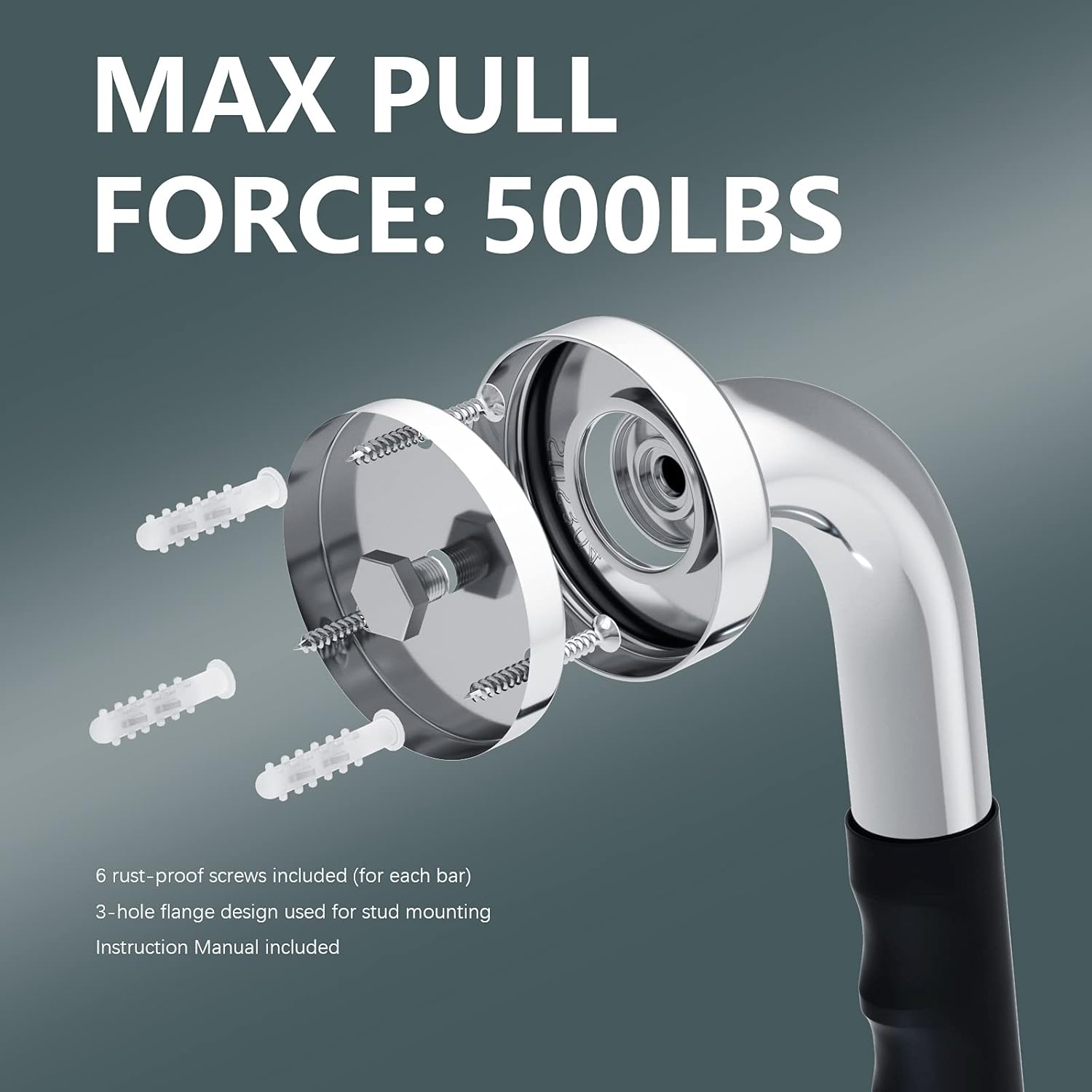 - Able to support up to 500 lbs of pull force to provide a stable, reliable handhold; Screw Length 1.6 inch/ 4.0cm. 2.2inch (56mm) flange; 1 inch (25mm) outer diameter; 25 gauge (25mm) stainless steel tube; 6 rust-proof screws included(for each bar); 3-hole flange design used for stud mounting. Made of SUS304 stainless steel for a lasting strength and quality.