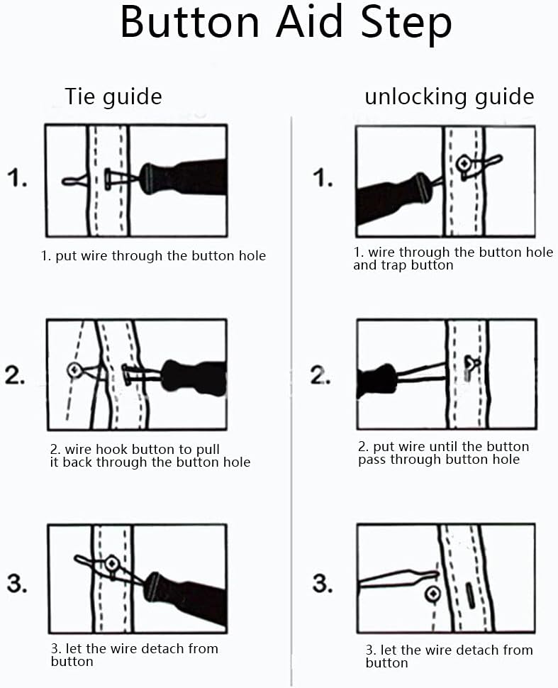 - Button hook --- it support to hook around small, medium, and large round buttons, so you can easily button your clothes independantly, This button aid tool feature a slim and sturdy steel wire loop. making pulling it through the buttonhole easier. the wire loop narrows at the tip to lock the button in place,