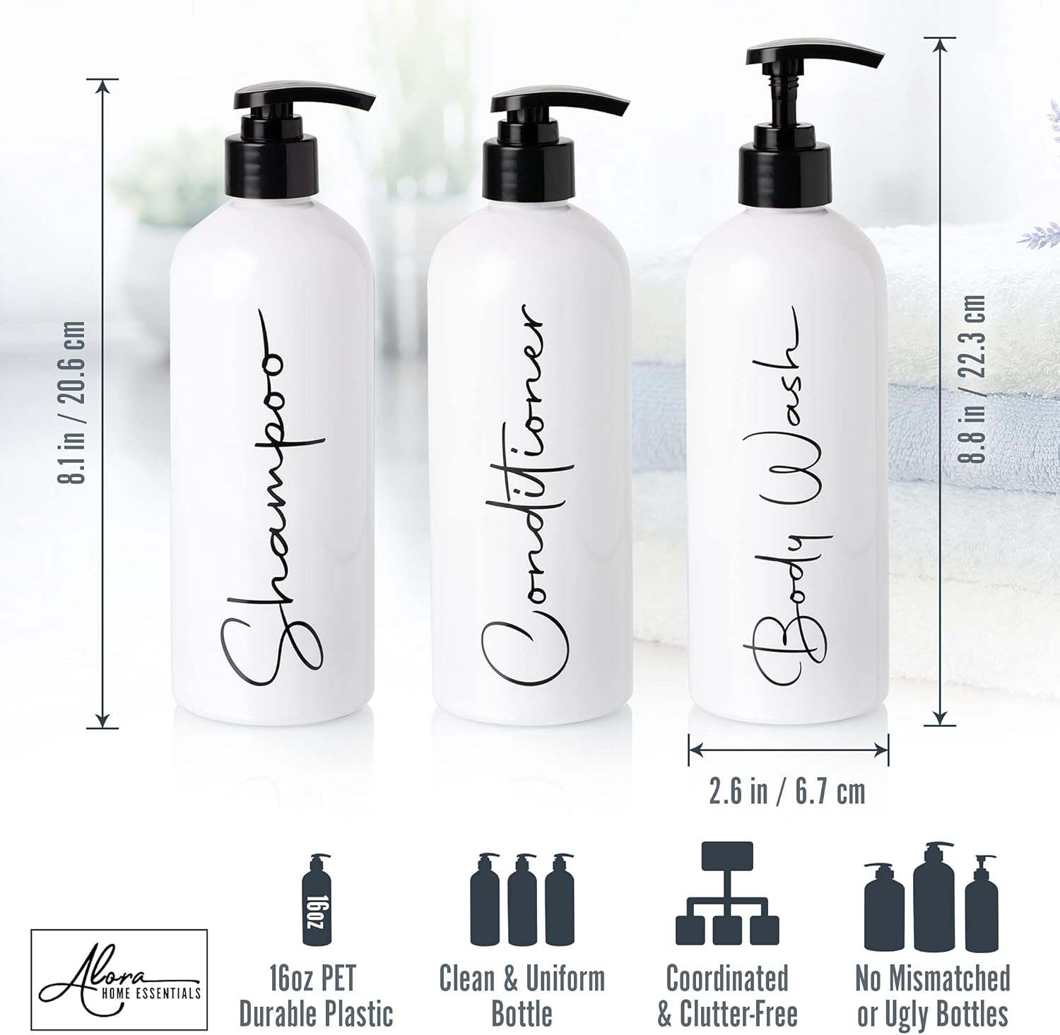 Alora 16oz Refillable Shampoo and Conditioner Dispenser Bottles - Set of 3 - Pump Bottle Dispenser for Shampoo, Conditioner, Body Wash - Empty Plastic Refillable Containers for Shower, Matte White