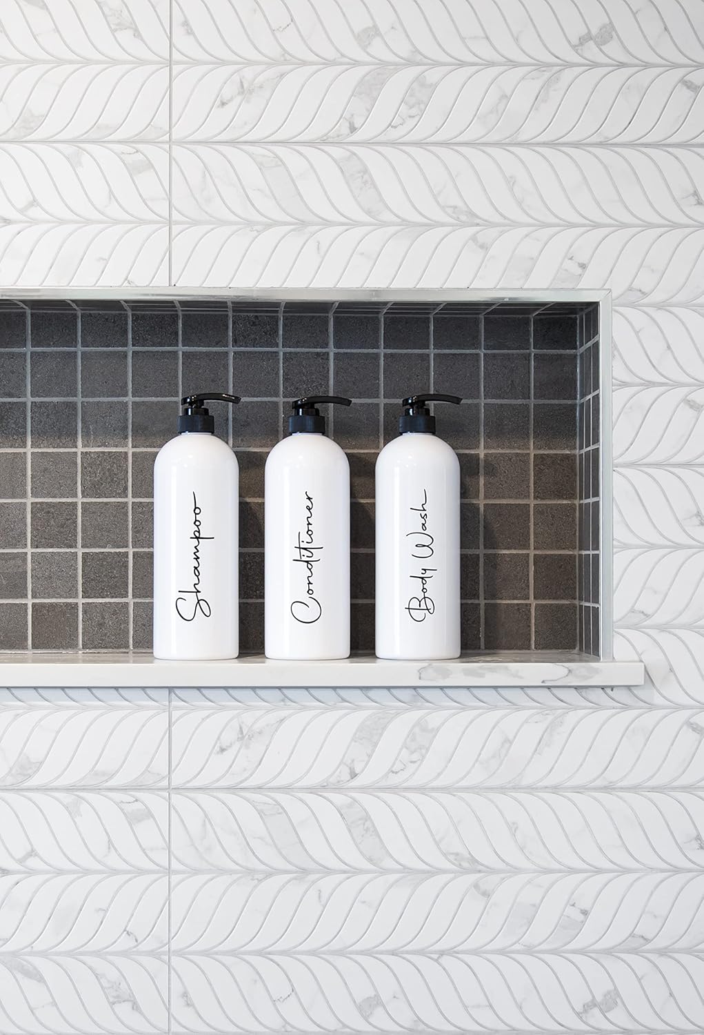 - FUNCTIONAL SHOWER ORGANIZATION - Bring classy style and seamless organization to your cluttered shower with 3 empty pump bottles for shampoo, conditioner and body wash. Perfect for home or commercial use in the hospitality industry. Exquisite and refined.