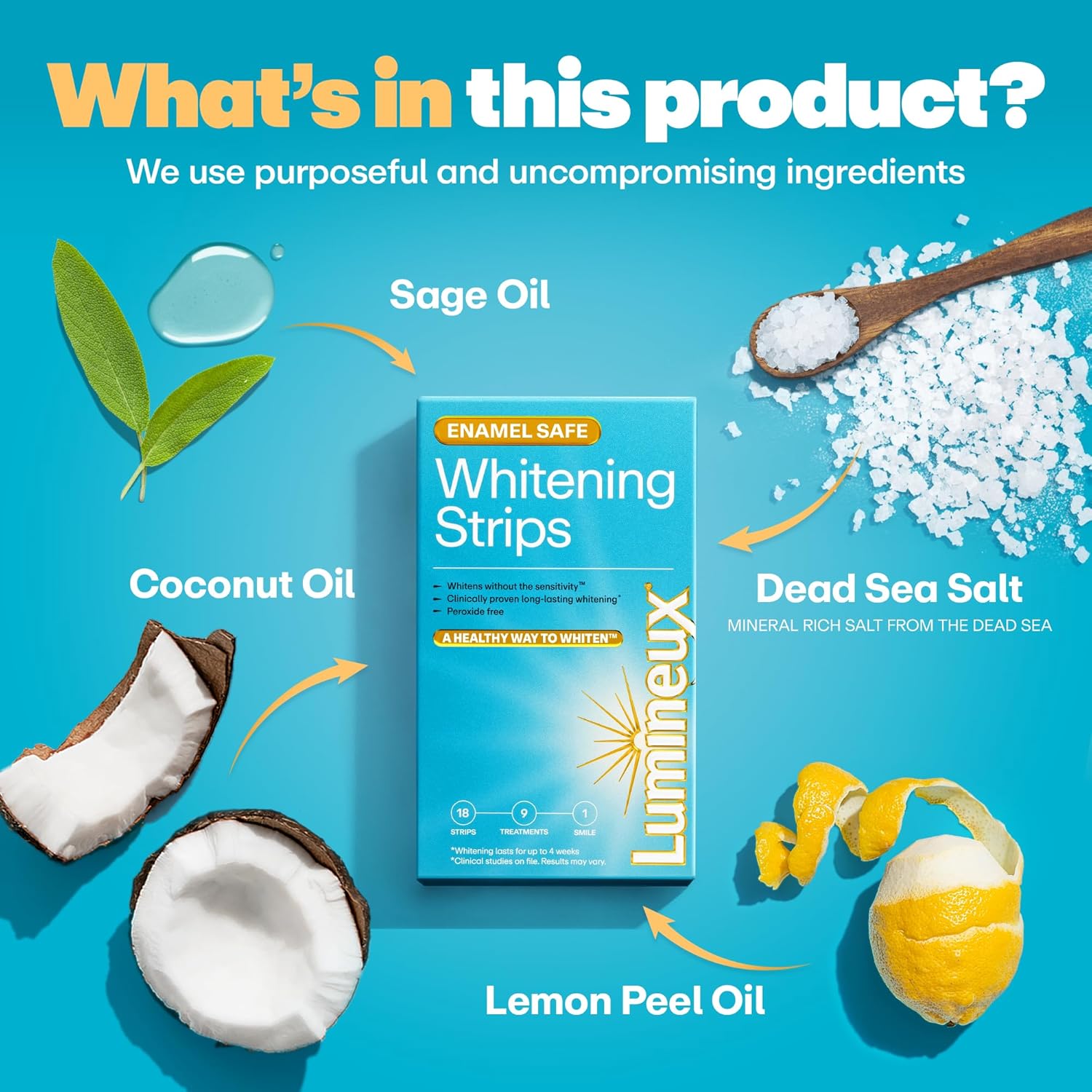 - Clinically Proven – This tooth whitening strip is clinically proven to whiten teeth without the sensitivity using a blend of good-for-you ingredients like Dead Sea salt, coconut oil and lemon peel oil.