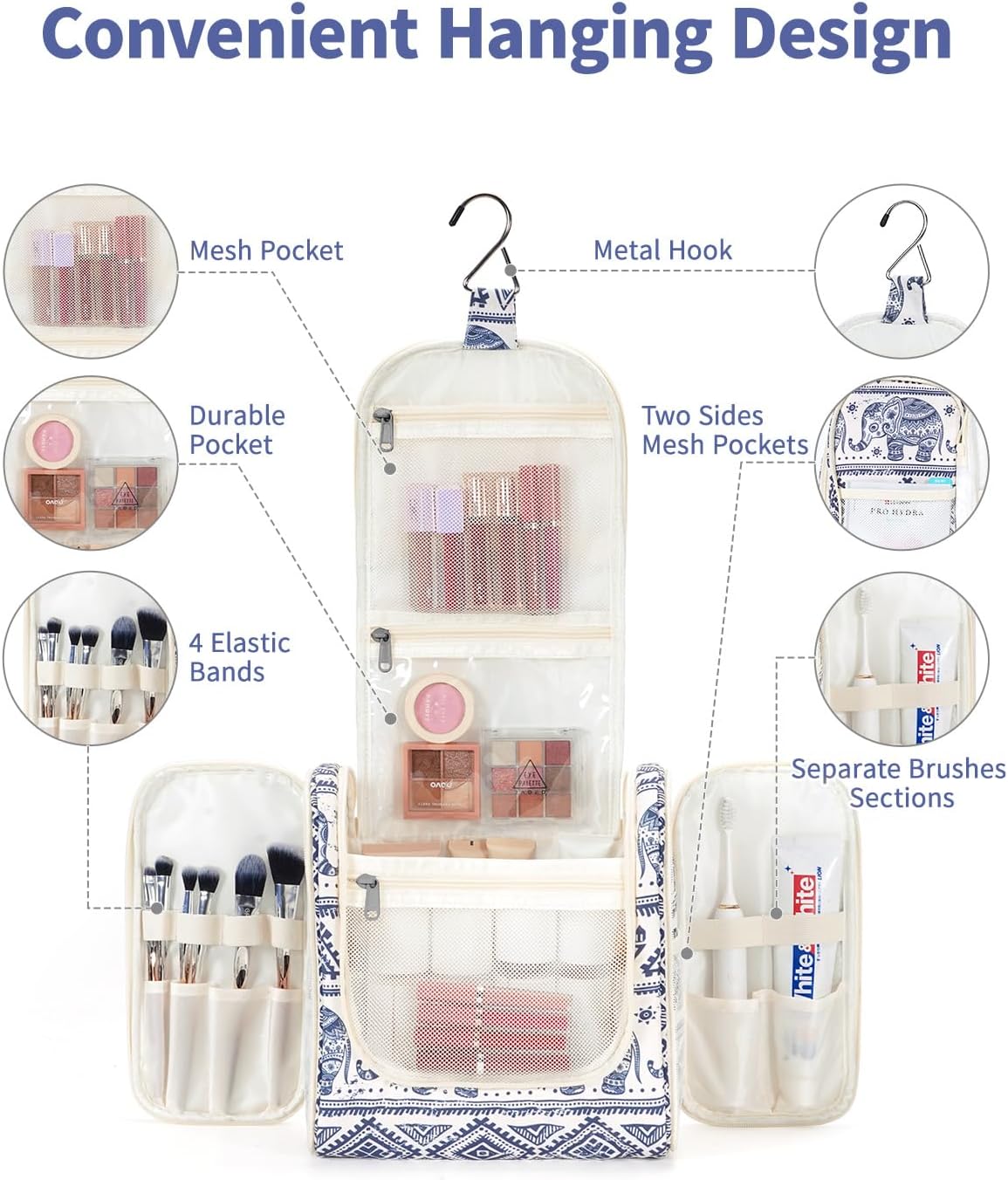 - DETAILS ORIENTED - Buit-in large metal hook allows hanging the toiletry case from towel rack, coat hook or whereever is available, making your toiletries and cosmetics displayed well for easy access, saving bathroom counter space as well. Water-resistent and durable fabric protects your gear from spills. Soft fabric and reliable zippers. Wide opening and rectangle shape makes it easy to stand on its own