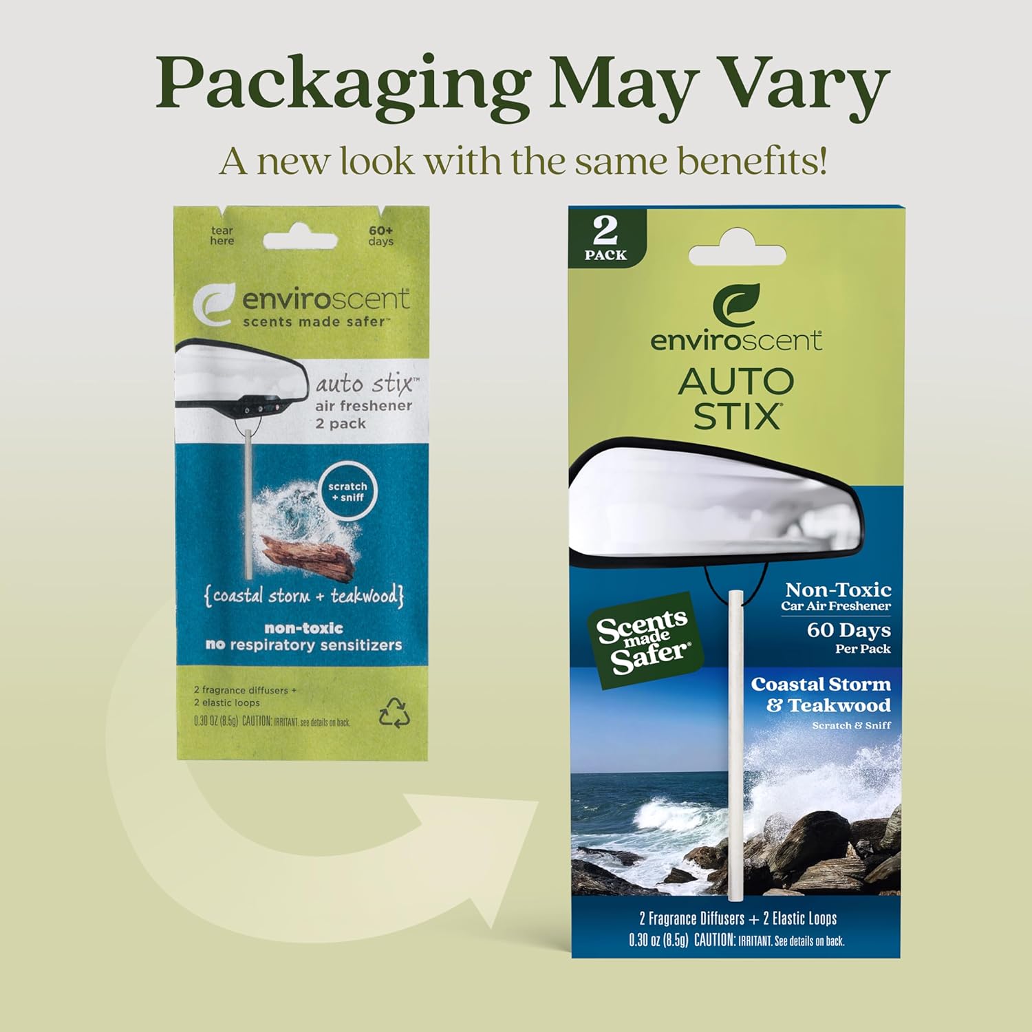 Enviroscent Non-Toxic Car Air Freshener (Coastal Storm & Teakwood) Natural Car Air Freshener | Essential Oil Diffuser | Car Scent Lasting Over 180 Days | 3 Packs of 2 Hanging Auto Stix