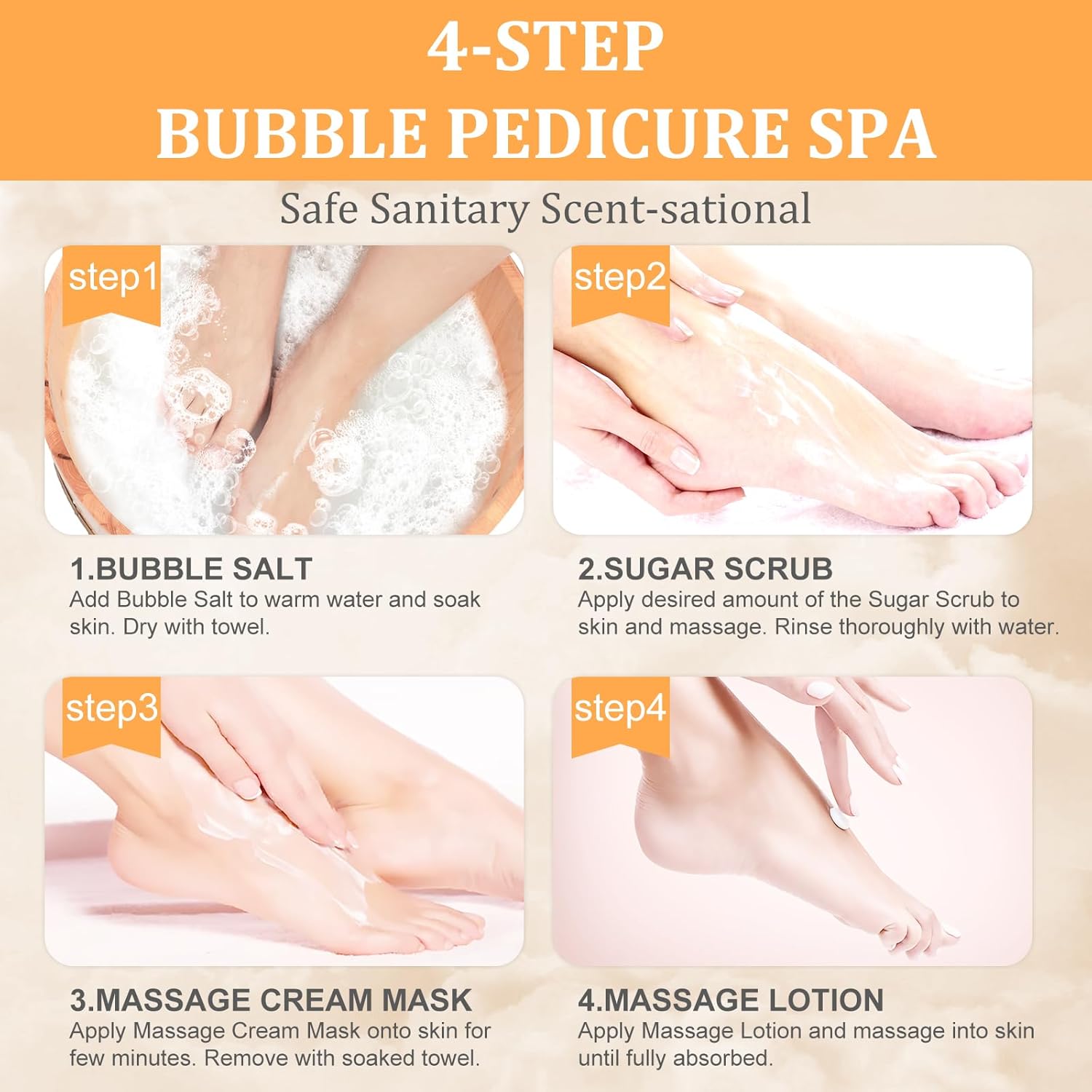 - 🍅[Package Includes]: Exfoliating Foot Spa Pedicure Kit consists of Bubble Salt, Sugar Scrub, Massage Mask, and Massage Lotion for a 4-step foot spa at home. Formated to be gentle on the skin, you are sure to feel your skin feeling soft and supple after use.