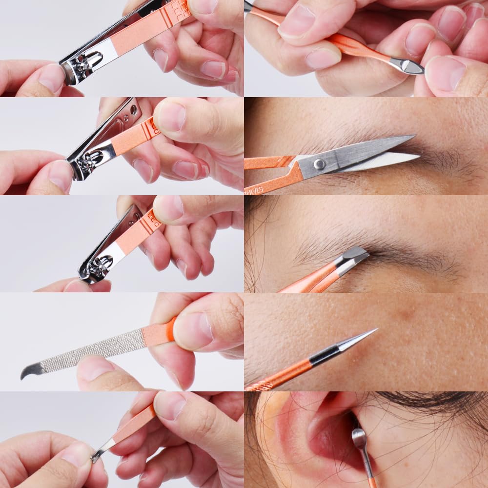 - Manicure Set (10 Pieces): HANTEKAS Professional Manicure Kit Contains 10 pieces nail and toenail tools for three functions must meet what you need, include hand care,facial care,foot care: Nail clippers for finger and toenails, cuticle pusher cleaner, nail file, v-shaped push stick cuticle trimmers, eyebrow tweezers, multi-purpose scissor, blackhead needle with loop remover and ear pick.