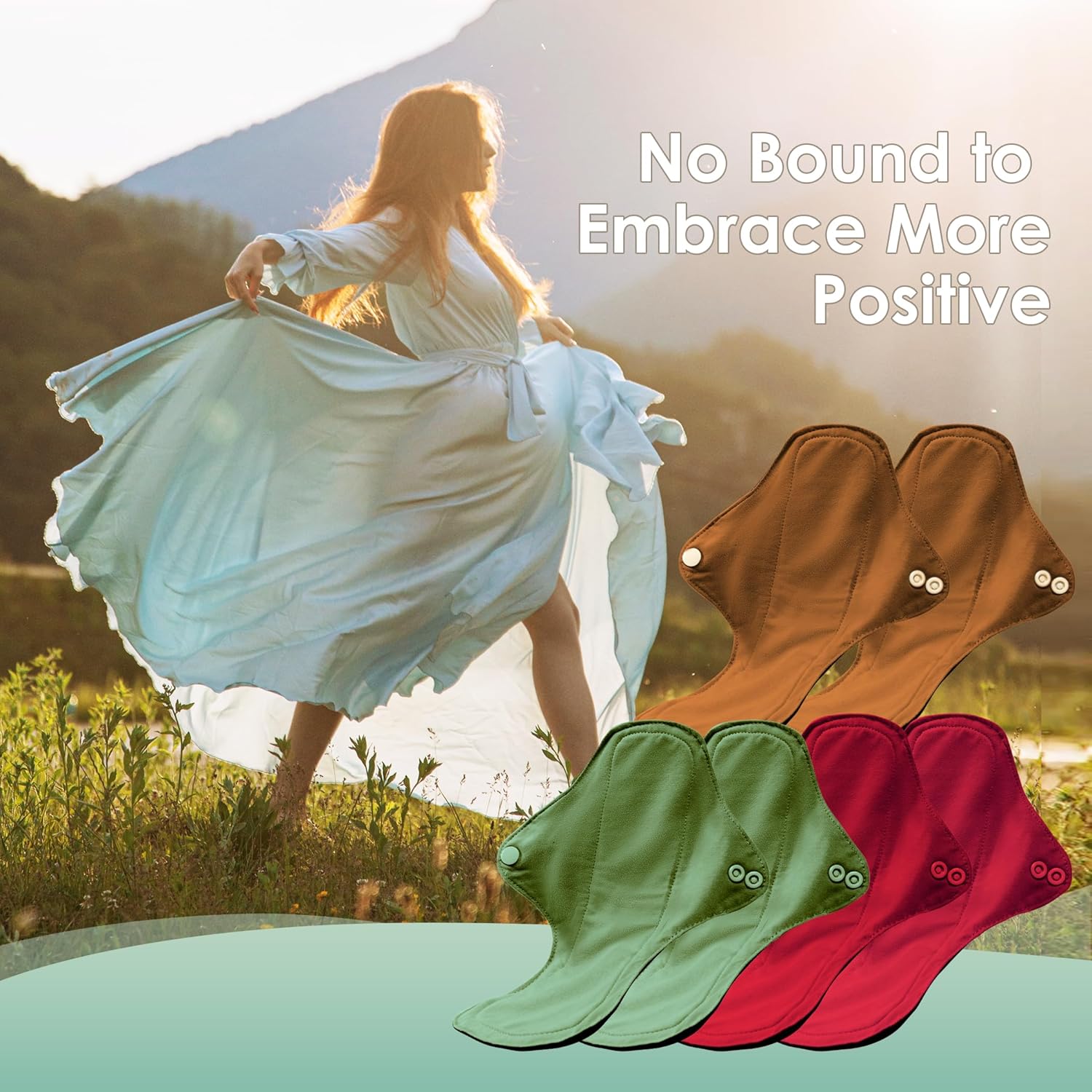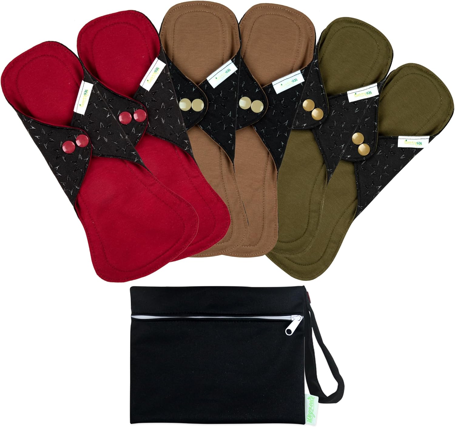 wegreeco 6 Pcs Reusable Menstrual Pads, Ultra Absorbent Cloth Pads for Light/Heavy Flow, Sanitary for Teens, Women, Nonslip Panty Liners + Bag (Aqua, Burgundy, Coffee, L)