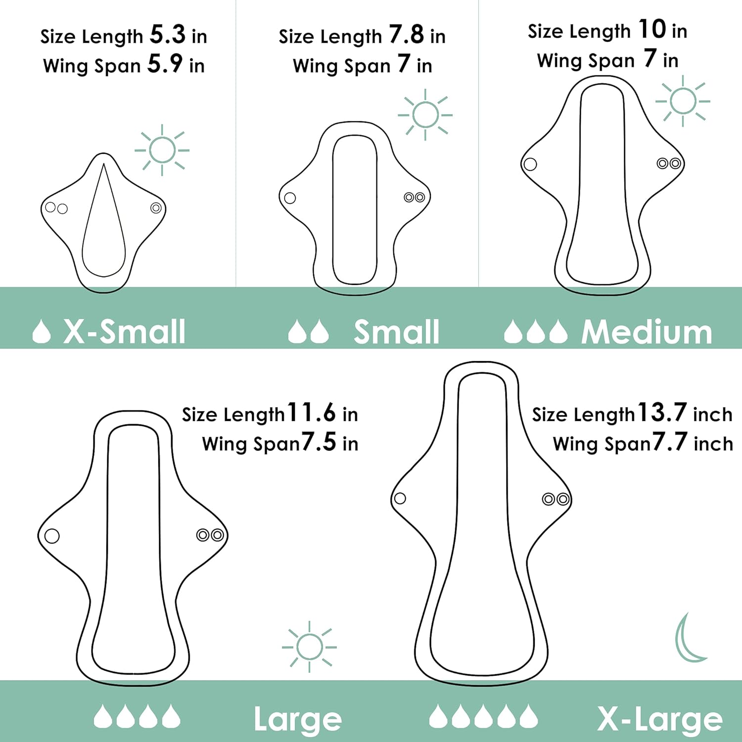 - 6 Pcs Cloth Pads in 5 Sizes: Each set cloth menstrual pads including 6 pack cloth panty liners. Wegreeco feminine Pads for Women are available in 5 sizes. Extra Small size length 5.3 in, wing span 5.9 in, Small size length 7.8 in, wing span 7 in, Middle size length 10 in, wing span 7 in, Large size length 11.6 in, wing span 7.5 in, Extra Large size length 13.7 in, wing span 7.7 inch