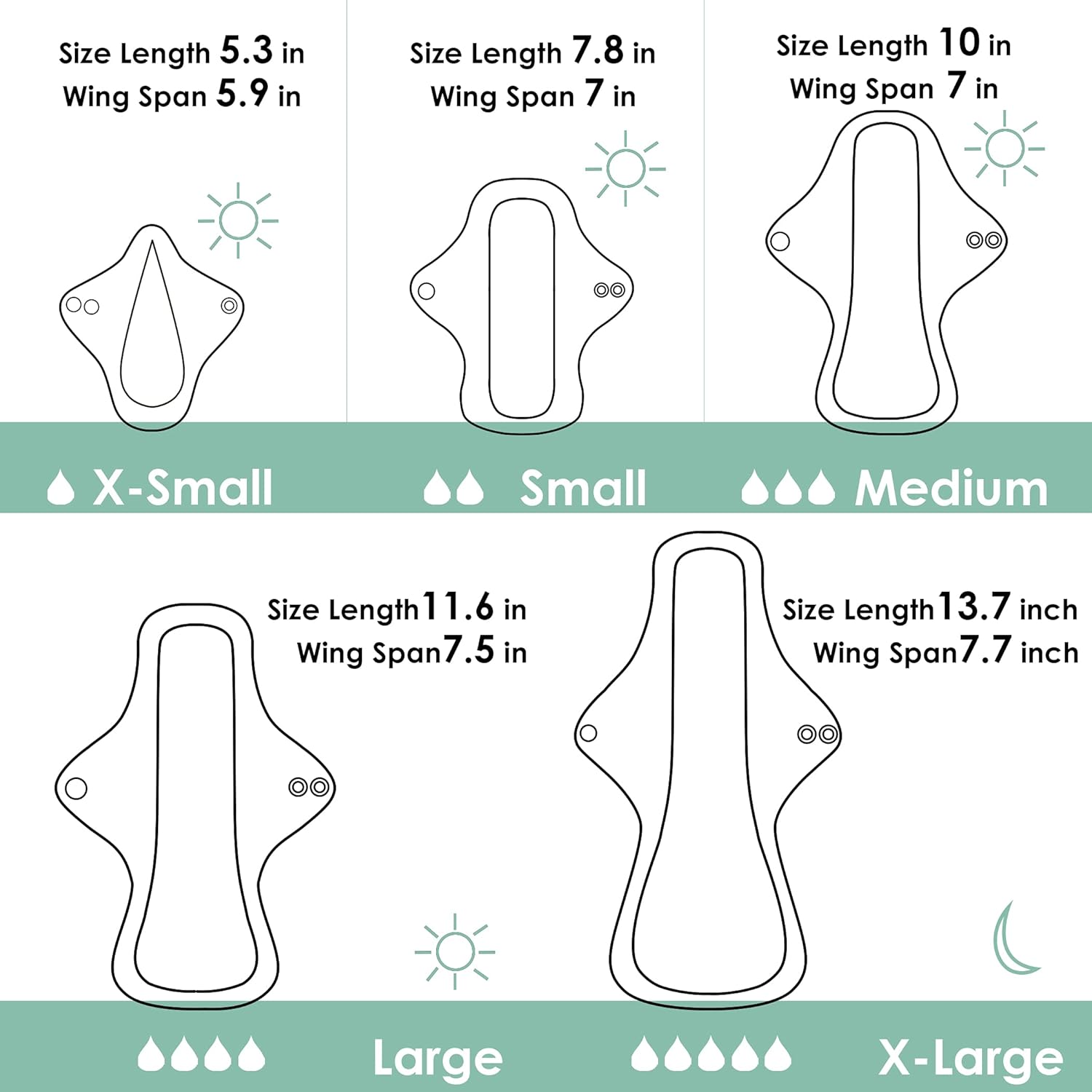 - 6pcs Cloth Pads in 5 Sizes: Each set cloth menstrual pads including 6 pack cloth panty liners. Wegreeco feminine Pads for Women are available in 5 sizes. Extra Small size length 5.3 in, wing span 5.9 in, Small size length 7.8 in, wing span 7 in, Middle size length 10 in, wing span 7 in, Large size length 11.6 in, wing span 7.5 in, Extra Large size length 13.7 in, wing span 7.7 inch