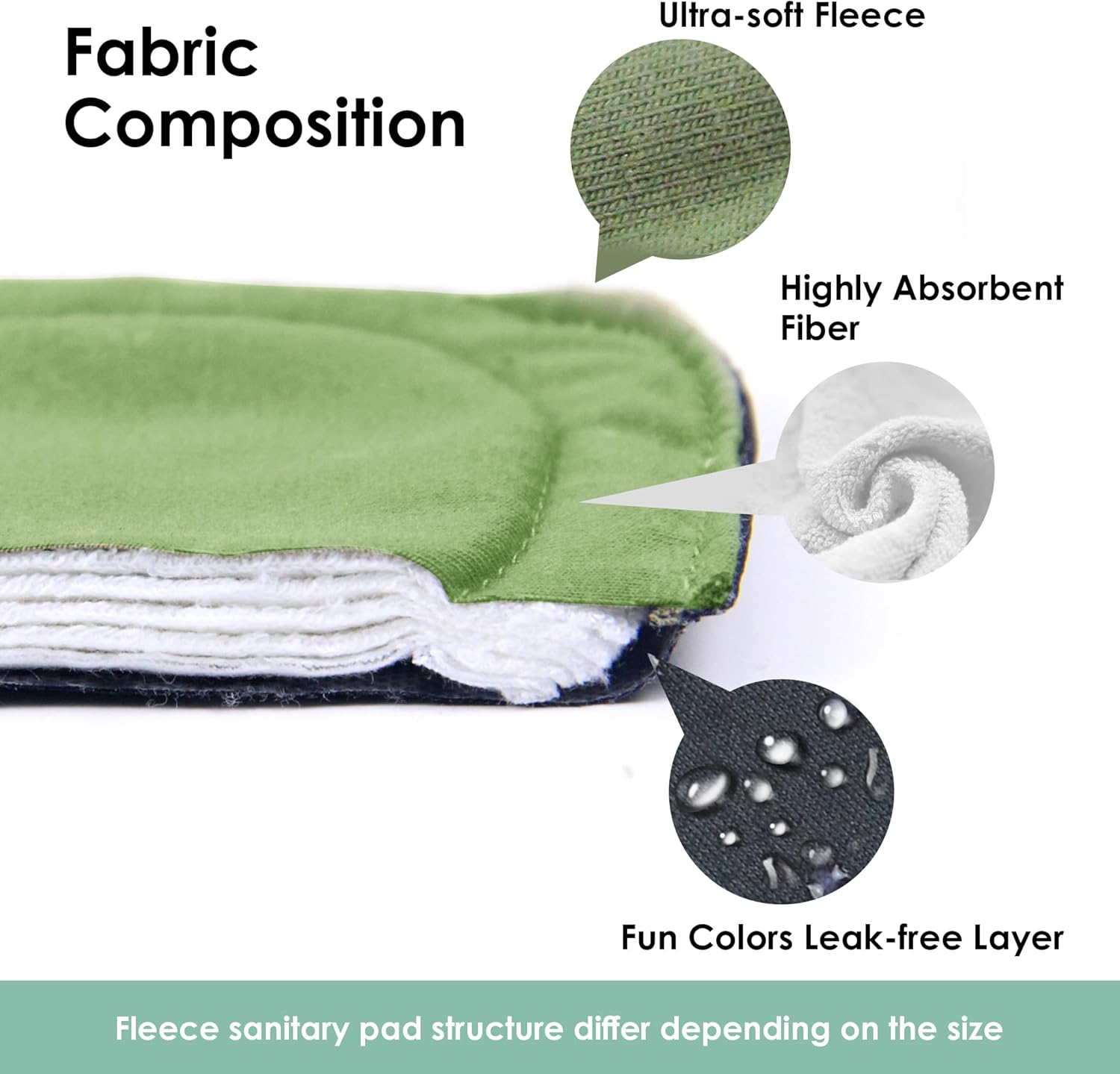 - Breathable Layer: Cloth panty liners structure differ depending on the size. Menstrual cloth pads Inner layer is ultra-soft fleece which lays against your skin, moistures wicking, and neutralizes odor.Lining layer is super-absorbent, and different sizes the layers are different. Outshell layer is leak-free TPU with backside silicon dot. The soft and gentle reusable sanitary pads offer great coverage and absorbency to keep you from any leaks and spills