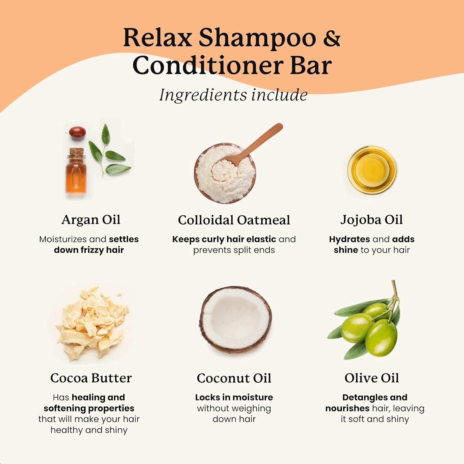 - Our Relax shampoo and conditioner bar helps to moisturize and smooth your curls; Perfect for dry or frizzy hair, essential oils work their magic without weighing down your hair; Coconut oil and butter add softness while Argan oil and Colloidal Oatmeal hydrate and nourish; Split ends will be a thing of the past