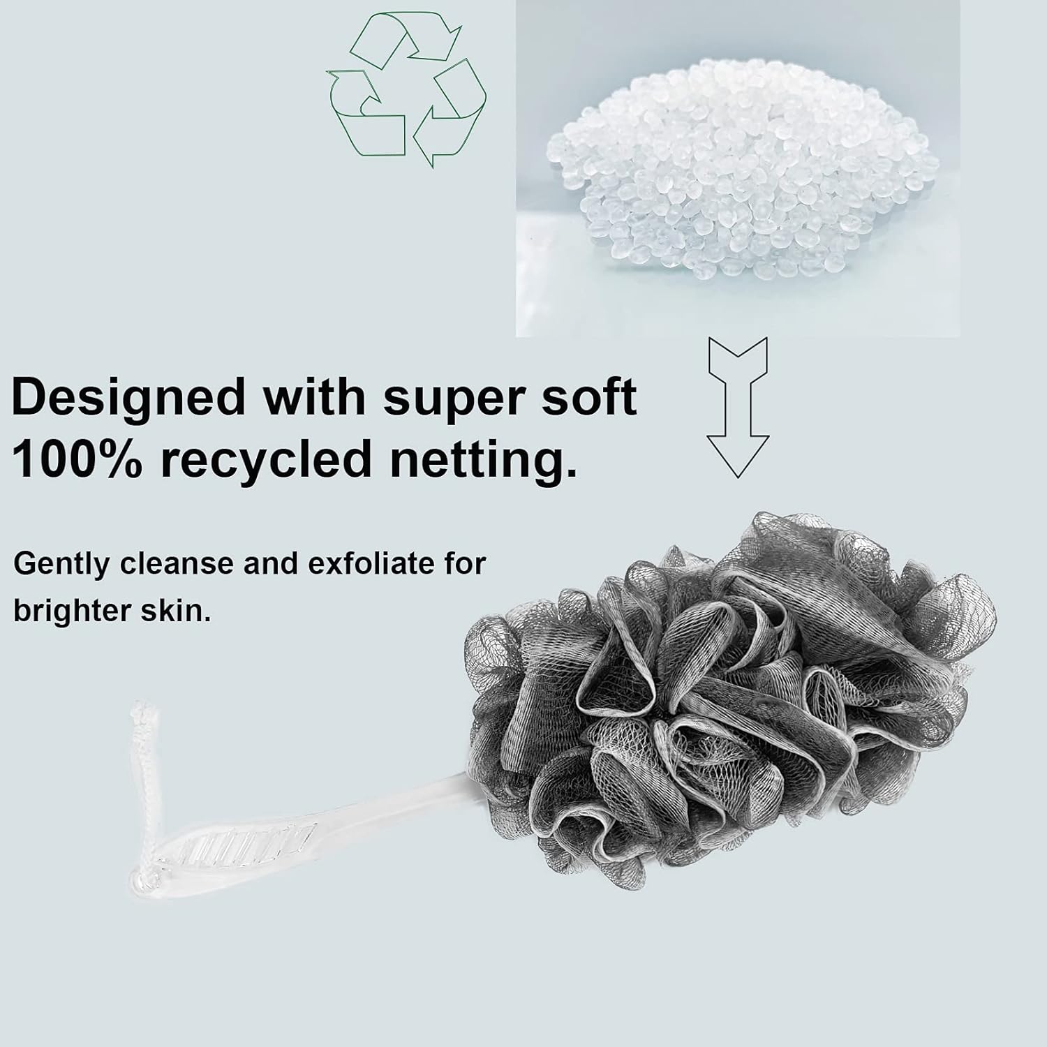 - (100% RECYCLED PE):Our exfoliating loofah brush is designed by super soft 100% recyled netting.You can use it safely. ANTI-SLIP design that you can grab the ends and clean your back effortless and won't slip out of your hand.