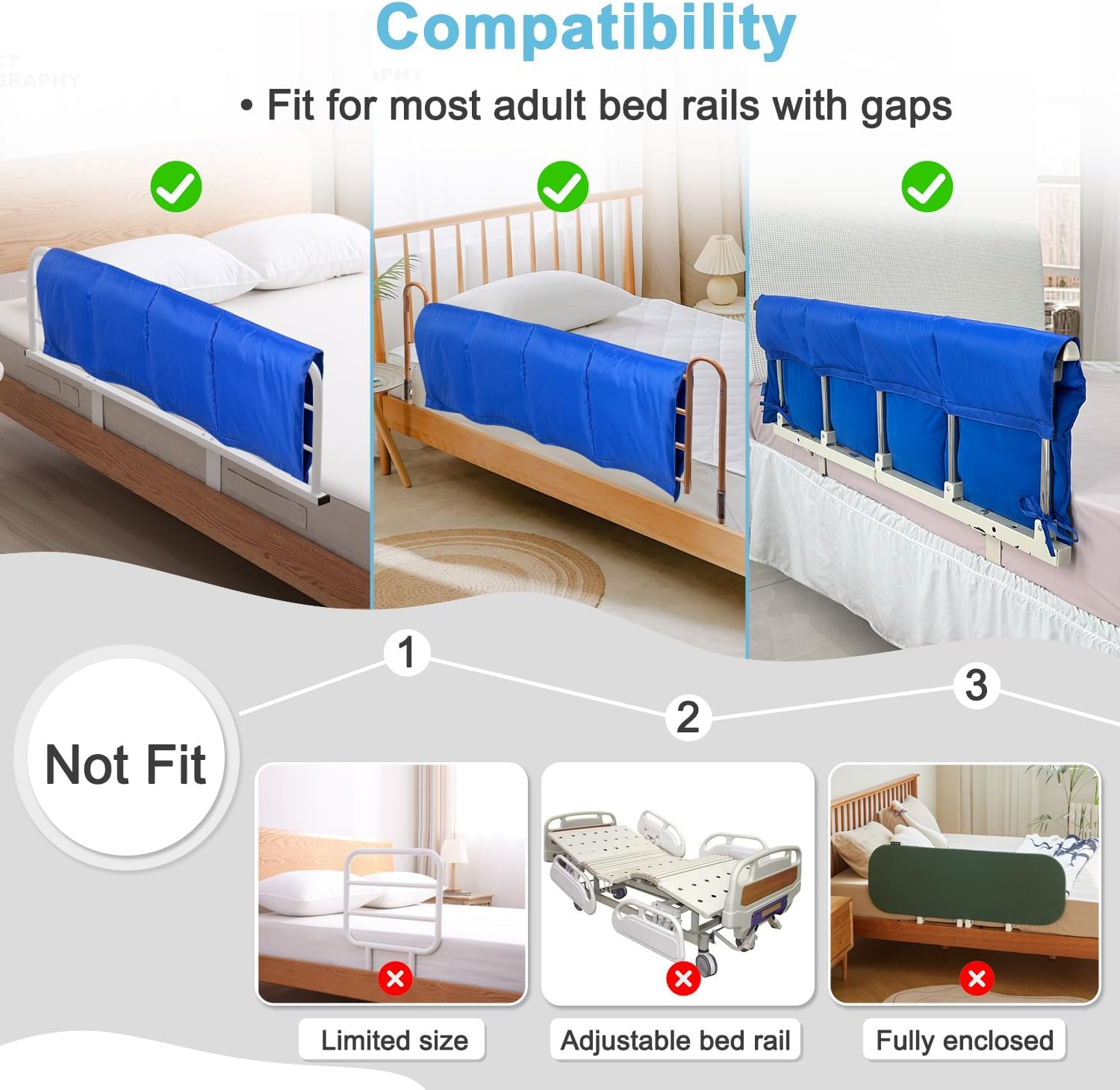 - ăSafety Bed Rail Paddingă The 48-inch long bed rail pad can easily to cover on the bed railing to prevent patients from colliding and causing injury, and avoid being pinched or falling due to large gaps in the bed railings.