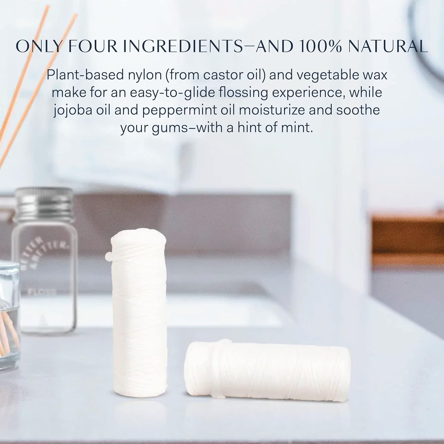 - In With the Better - Our vegan dental floss gently clears away plaque and harmful residue from your mouth while eliminating plastic from your flossing routine. Our dental lace is derived from four clean, simple, and vegan ingredients: plant-based nylon from castor oil, vegetable wax, Jojoba oil, and peppermint oil infusion. Each plastic free dental floss comes with a refillable glass jar.