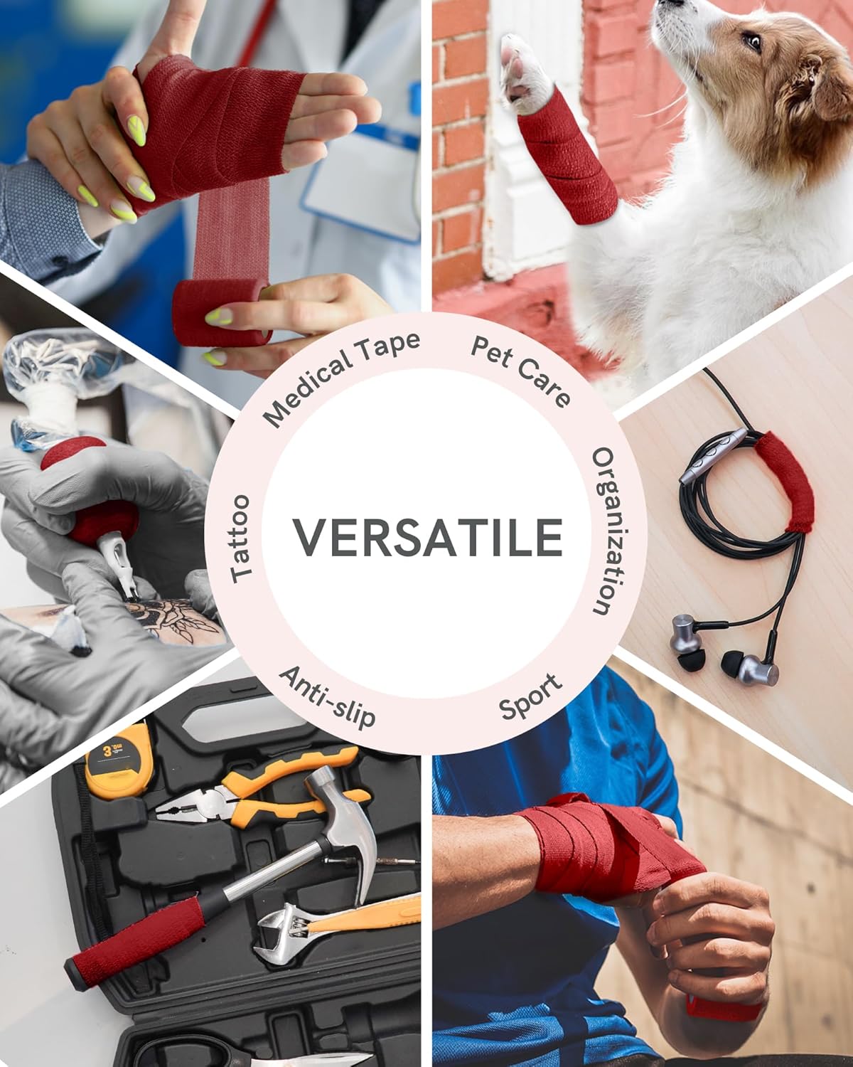 - Muitifution Redefined: Embrace unparalleled flexibility with our burgundy 6 rolls self-adhesive bandage pack. Whether for sports injuries or post-surgery recovery, our bandage ensures versatile protection, offering comfort and ease of movement. Experience the ultimate fusion of care and flexibility.