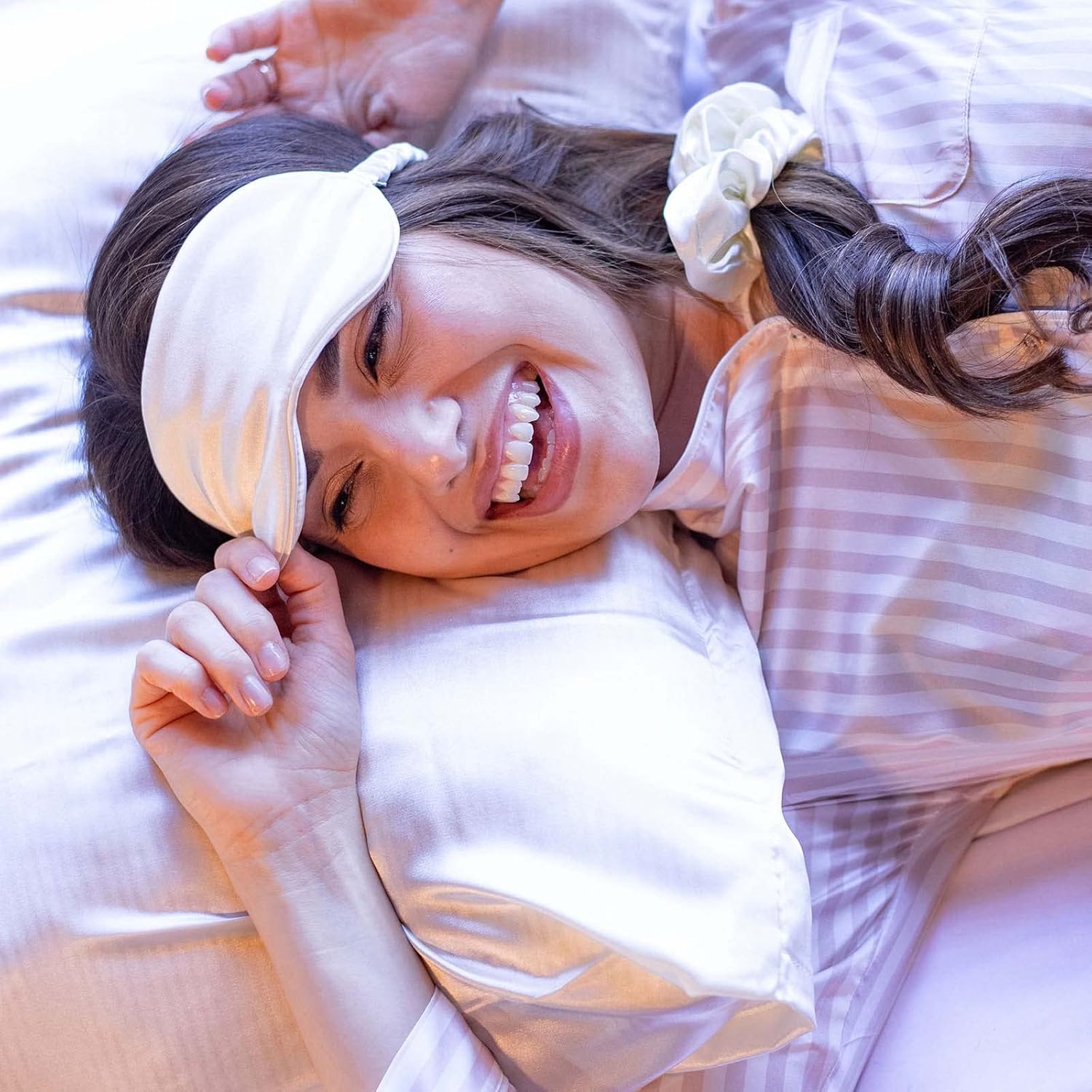 - PERFECT FOR YOUR SKIN: The soft and silky-textured material of this Night Routine Kit limits friction from the fabric to your skin and reduces the apperance of sleep wrinkles. Unlike cotton fabric, this satin finish fabric is less absorbent, and your night time skincare will stay in place. The soft cotton padded vegan silk eye mask blocks out light and ensures complete darkness for a stress-free sleep.