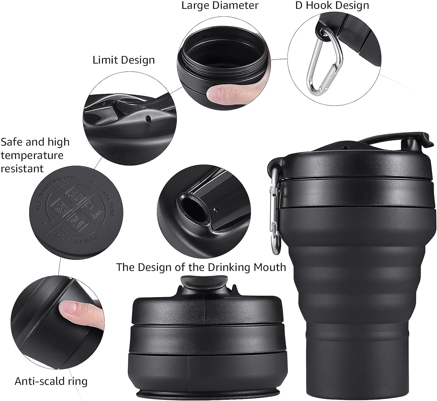 Collapsible Coffee Cup, 16 OZ 480ml Large Silicone Folding Camping Mug, Leak Proof BPA Free Portable, Travel Bottle with Lids for hiking, Microwave & Dishwasher Safe (Black)