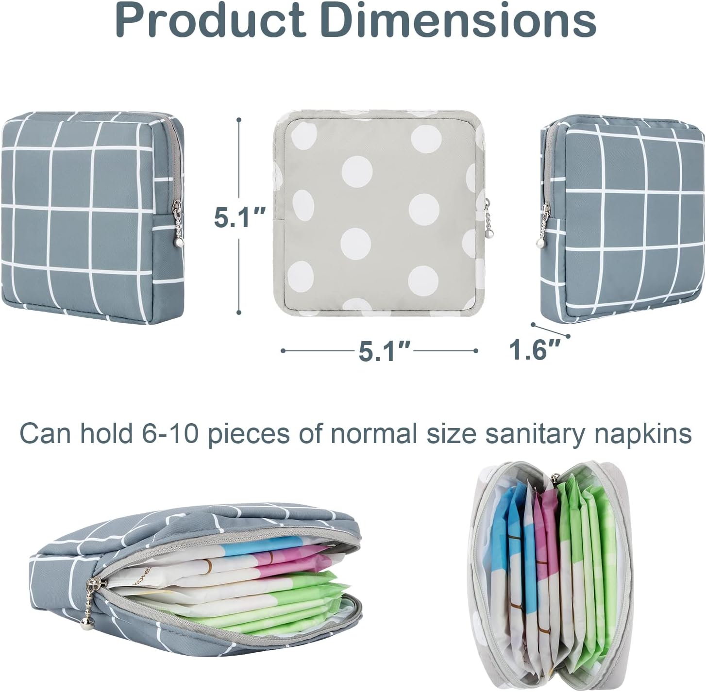 - 💕【Meet Your Day's Needs】- The size of the period pads bag is 5.1*5.1*1.6 inch, it can hold 6-10 pieces of normal size sanitary napkins. The compartment design inside the menstrual pad bag is easy to store tampons and Keep them clean and orderly. It can be easily put in your backpack or handbag.