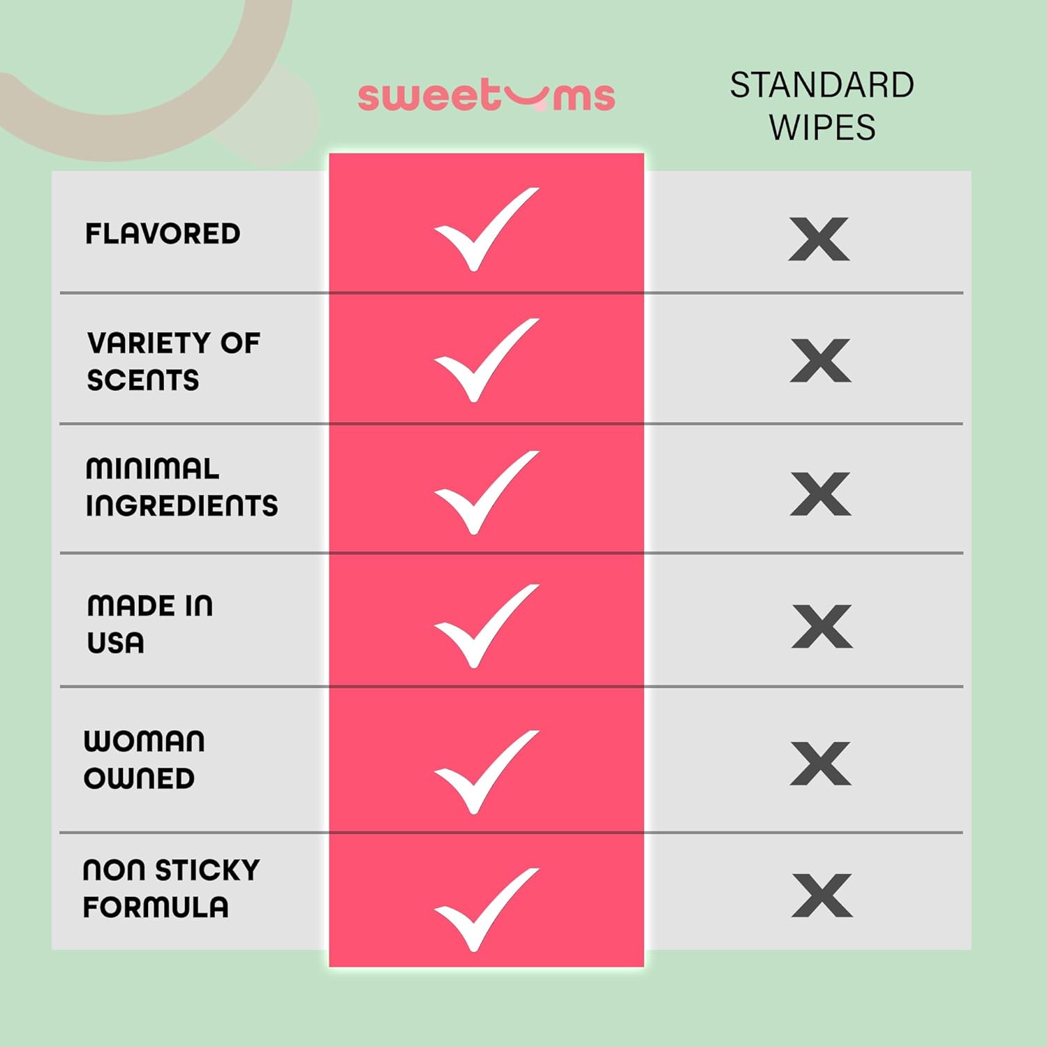 - 🌈 DELICIOUS & REFRESHING: Sweetums flavored wipes are the only female wipes that help with both personal hygiene and have a natural flavor that your partner will love!