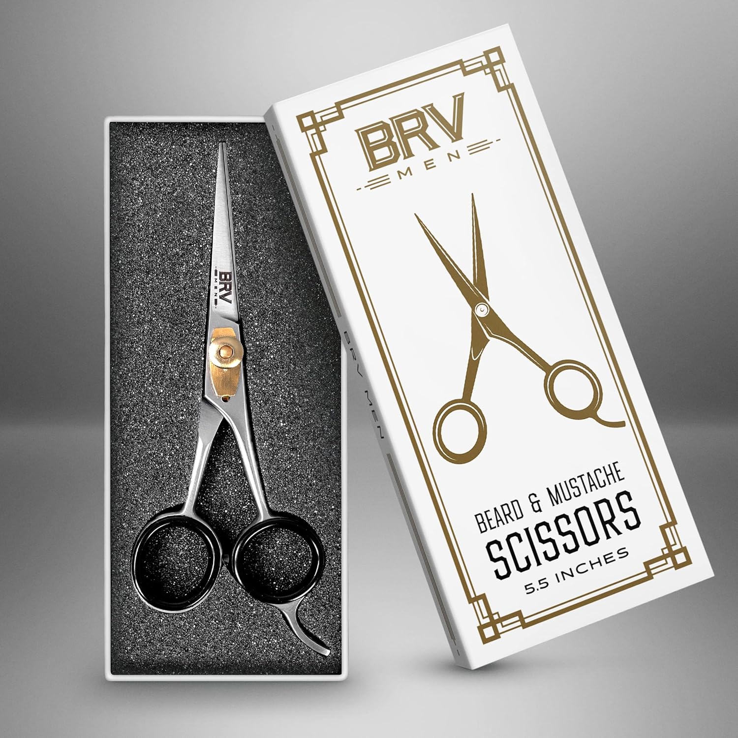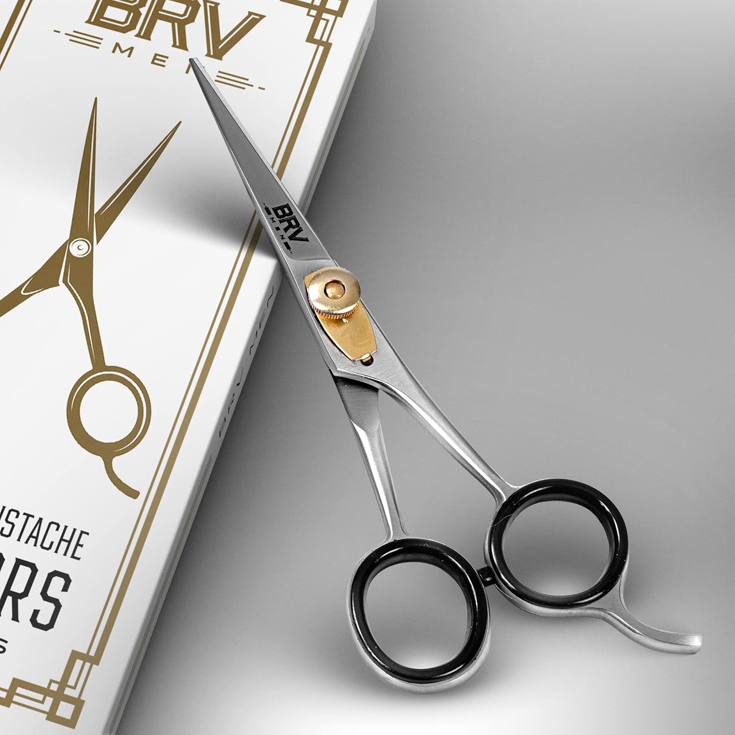 - THE CLASSY LOOK OF A TIMELESS DESIGN With our mustache and beard scissors style begins with the box itself. Simple lines and elegant simplicity announces the classy tool within. Shears that will immediately become a favorite addition to your grooming shelf. Choose between black or silver finish stainless steel, while gold colored brass adjustment pins finish off the effect in absolute style. Best Beard Trimmer Scissors For Men.