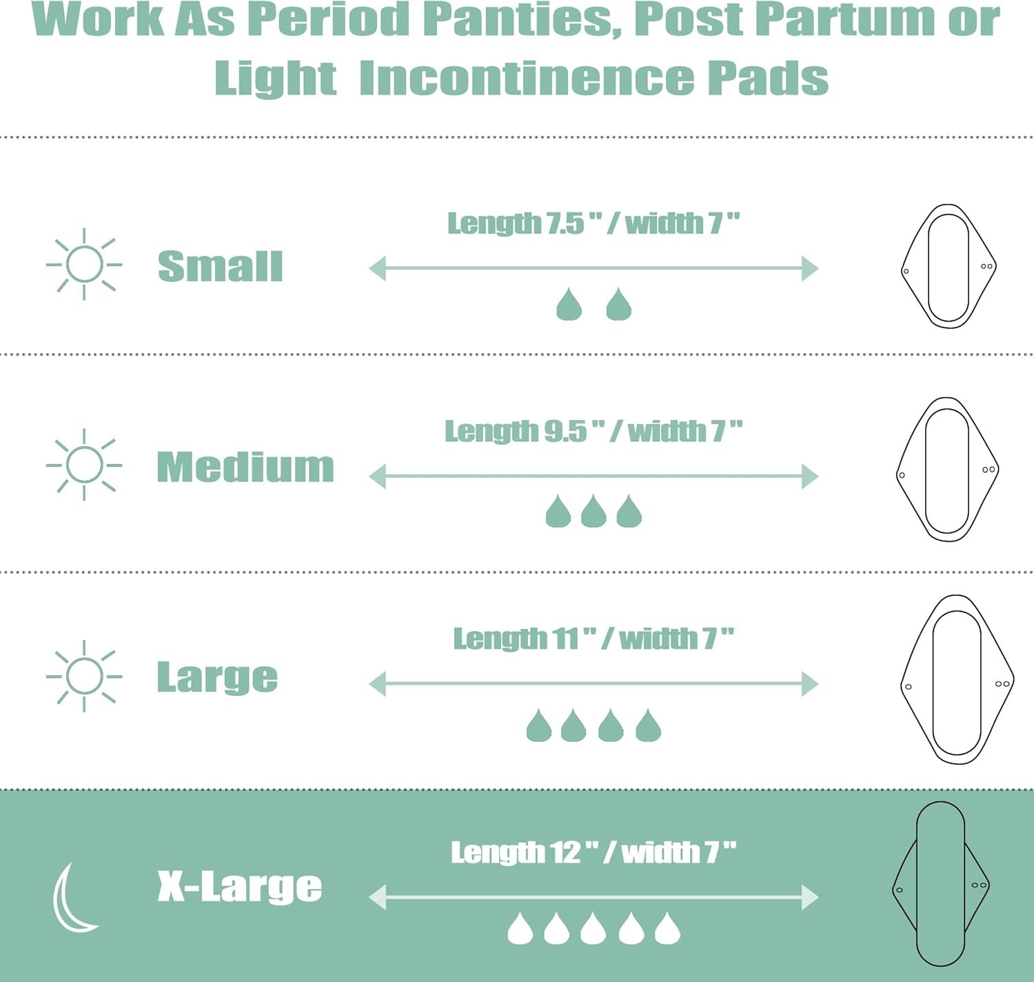 - Four Size Available, small size 8 inch long X width (including wings) 7 inch, Middle size 9.5 inch long X width 7 inch, Large size 11 inch long X 7 inch, Extra Large cloth pads, length 12 inch X width 8 inch. We recommend 6-12 small/medium cloth menstrual pads and 1-3 large heavy flow mama cloth pads