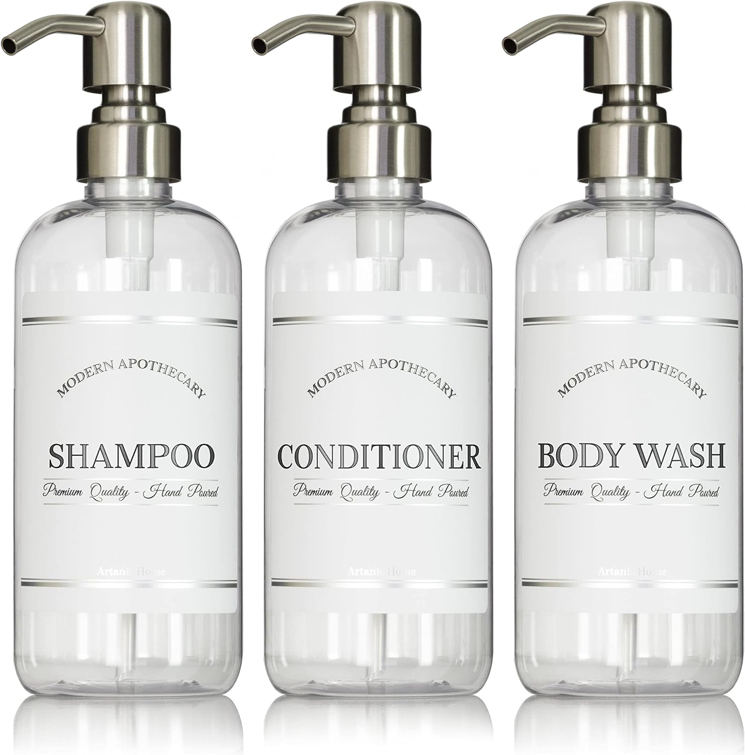 - Bring Style To Your Bathroom: Revel in the luxury of a well-organized shower. Refine your interior decor with these chic body wash, conditioner and shampoo dispenser bottles. Curate your whole home. Modern Apothecary bathroom bottles coordinate with additional matching titles for the sink, kitchen, office, and rentals. Classy, with a touch of retro flair