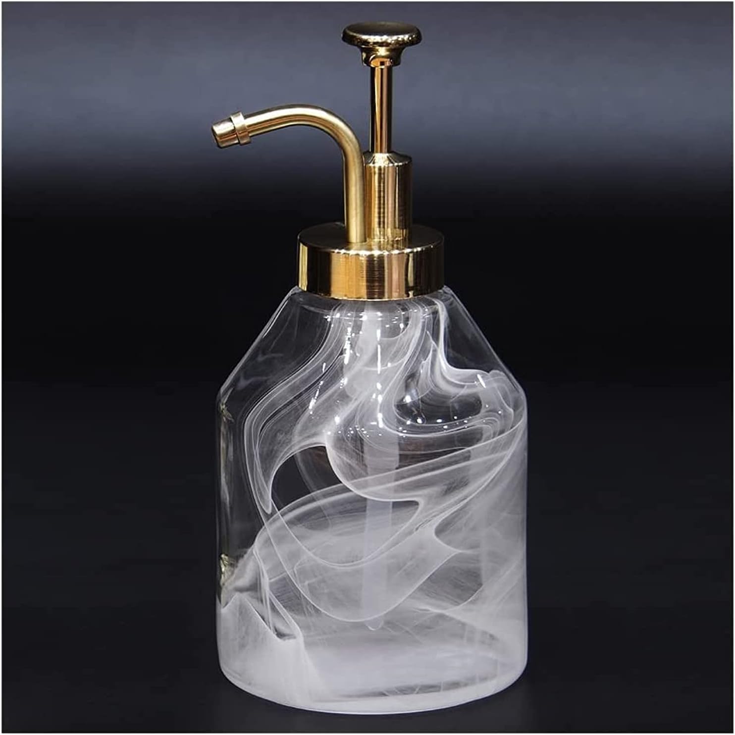 - HAND-BLOWN MARBLE GLASS SOAP DISPENSER: Unique 3D white smoke pattern in Thick glass soap gold top pump bottle Like ever changing cloud floating in the clear sky, looks stunning & elegant. Decorative boho soap dispenser easy match any style of bathroom, kitchen, bedroom, farmhouse decor. Aslo Great for office,commercial use,luxury Hotel/Club Ornaments. Great Mother's Day Gifts.