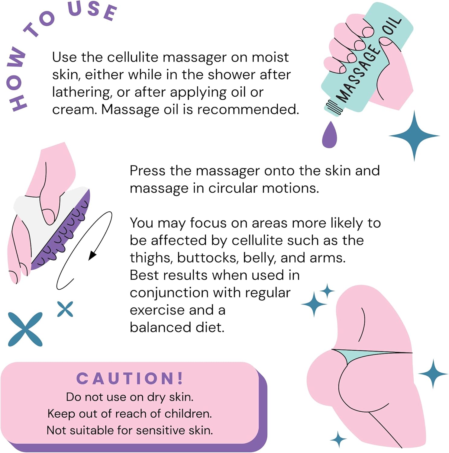 - Anti-Cellulite: Works best in conjunction with a healthy diet and plenty of exercise. You'll begin to lose cellulite pockets on your thighs and buttocks. Use the massager with anti-cellulite oil for smooth rubbing & application. Face massager, back and body exfoliator. Silicone body scrubber is great for all parts of the body. Apply pressure as necessary with oil. #1 exfoliating brush body brush on the market!
