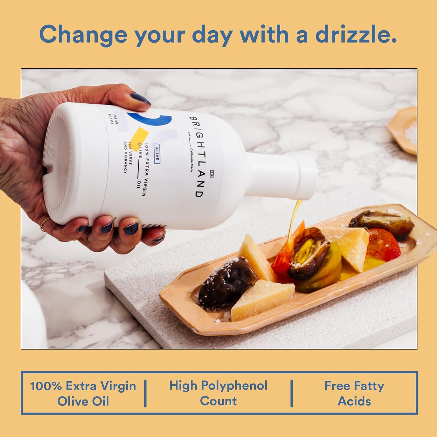 Brightland Extra Virgin Olive Oil, Alive - High Polyphenol Cold-Pressed Oil Ideal for Salads, Hummus, Baked Goods & Bread - Made from Arbosana, Arbequina & Koroneiki Olives - 12.7 Fl Oz
