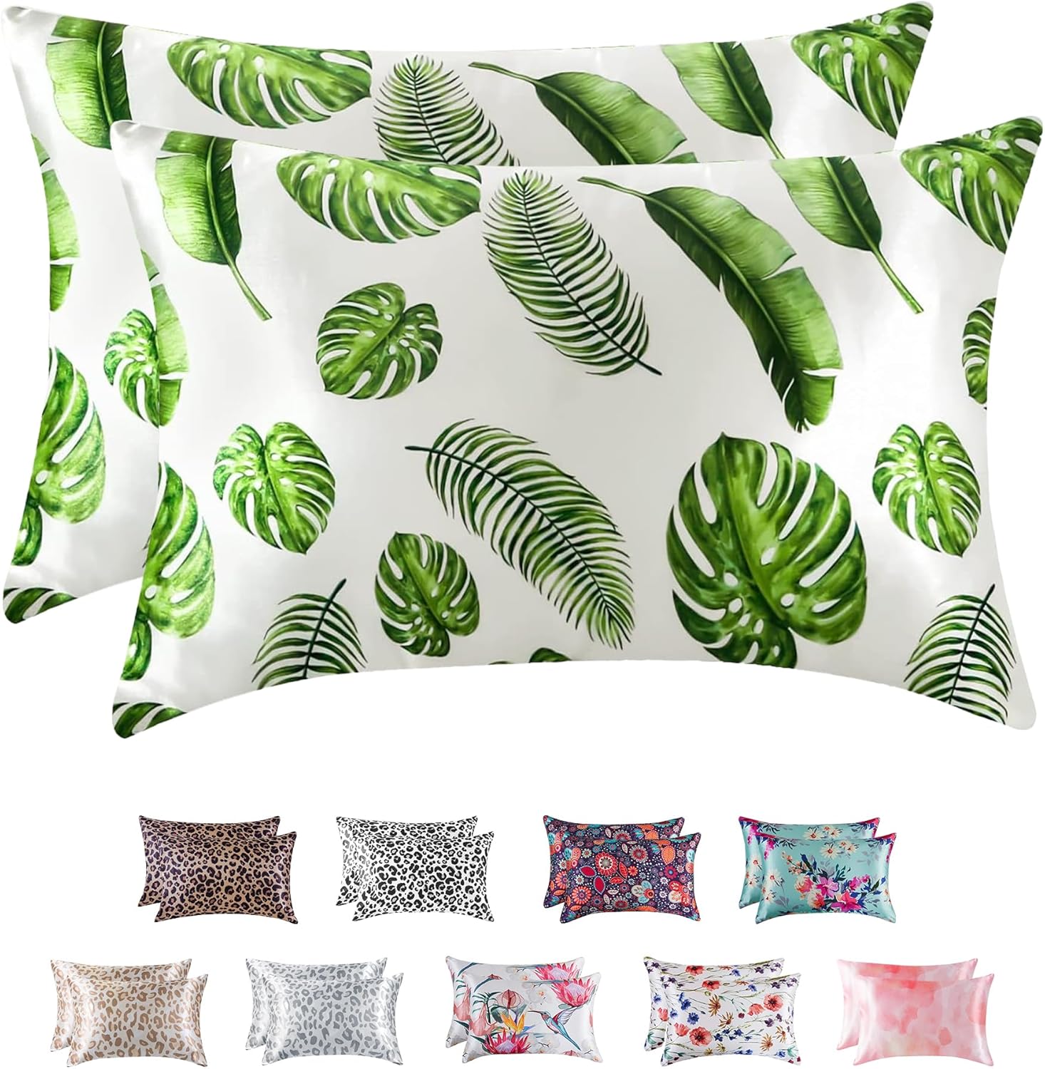 MR&HM Satin Pillowcase for Hair and Skin, Silk Satin Pillowcase 2 Pack, King Size Pillow Cases Set of 2, Silky Pillow Cover with Envelope Closure (20x36, Leaves)