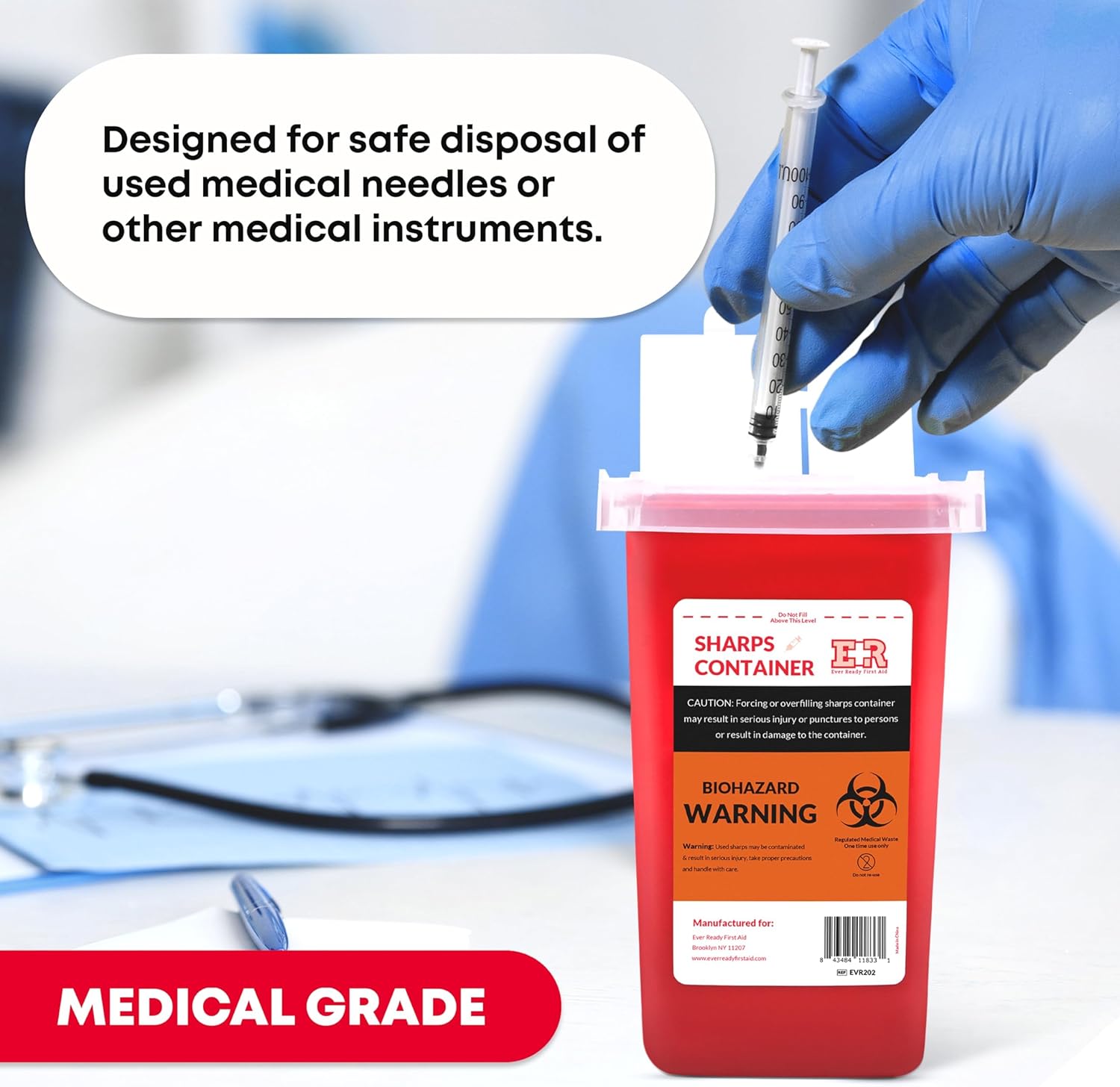 - SAFE SHARPS DISPOSAL – A sharps container is a medical storage box for collecting, storing, and disposing of used sharp medical supplies such as syringes, lancets, catheters, needles, blades, etc.