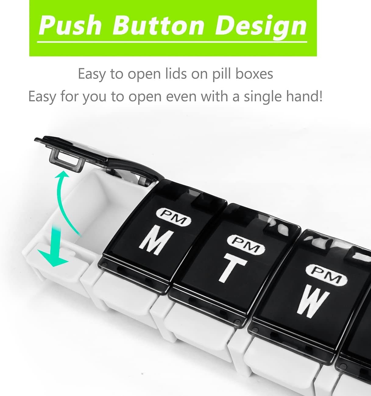 - Easy To Open: Our Extra Large 2 times a day pill box comes with push button design, press gently with your thumb on the front of this large 7 day pill organizer and the lid pops open, arthritis friendly, making it incredibly easy for you to open even with a single hand!