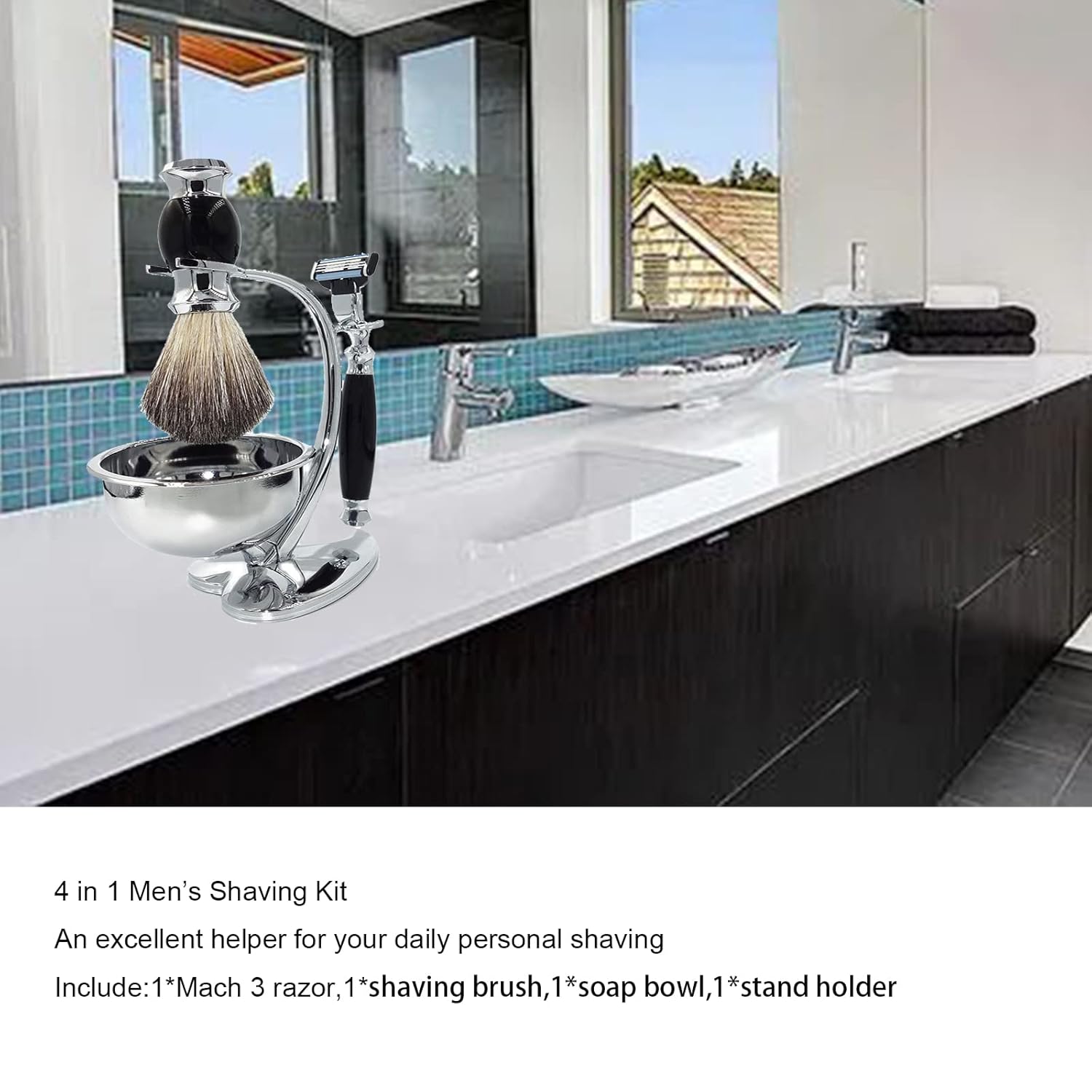 - Ideal Shaving Kit:4 in 1 wet shave kit include Mach 3 razor compatible with Gillette Mach 3 blade,1 piece 3-layer blade,badger hair Lather brush,soap bowl and heart shape stand holder.