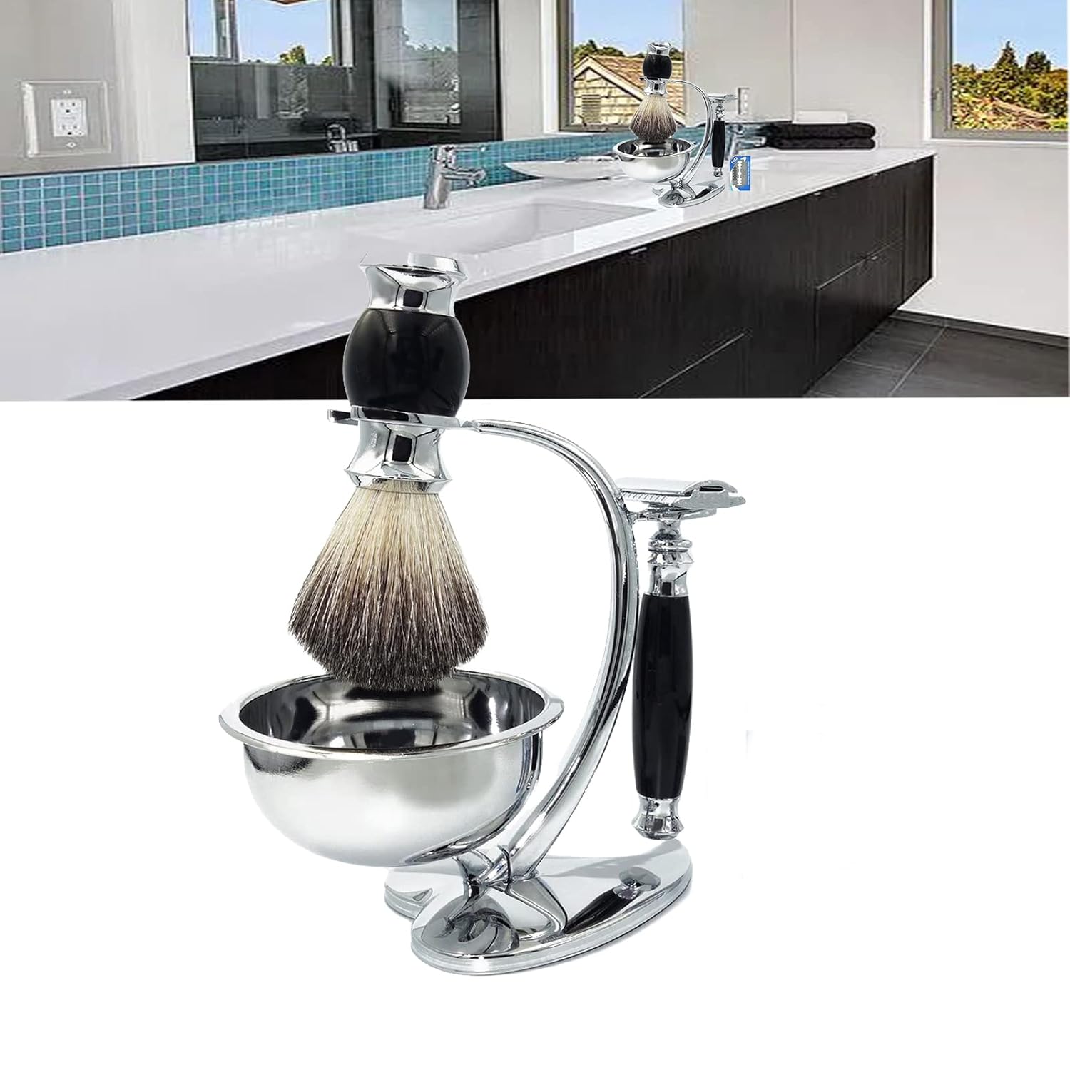 - Ideal Shaving Kit:4 in 1 wet shave kit includes Manual double edge safetry razor with 10 blades,badger hair Lather brush,soap shaving brush bowl and heart shape stand holder.