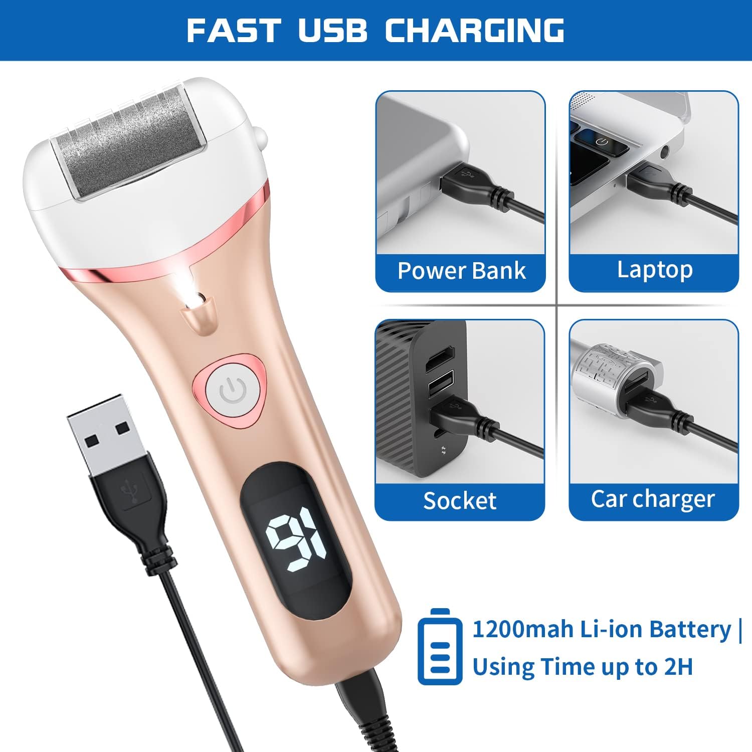 - 【Rechargeable & Equipped with Lcd Digital Battery Display and Light】The electric foot file with high quality 1200mAh large capacity lithium battery can working for about 60-90 Minutes. Only charge about 2-3 Hours. And it equipped with lcd digital battery display and light, you can see how much battery left and when to charge. Foot care for women, this foot scrubber dead skin remover's light turns on automatically while the foot file is working, shining light on your dead skin.