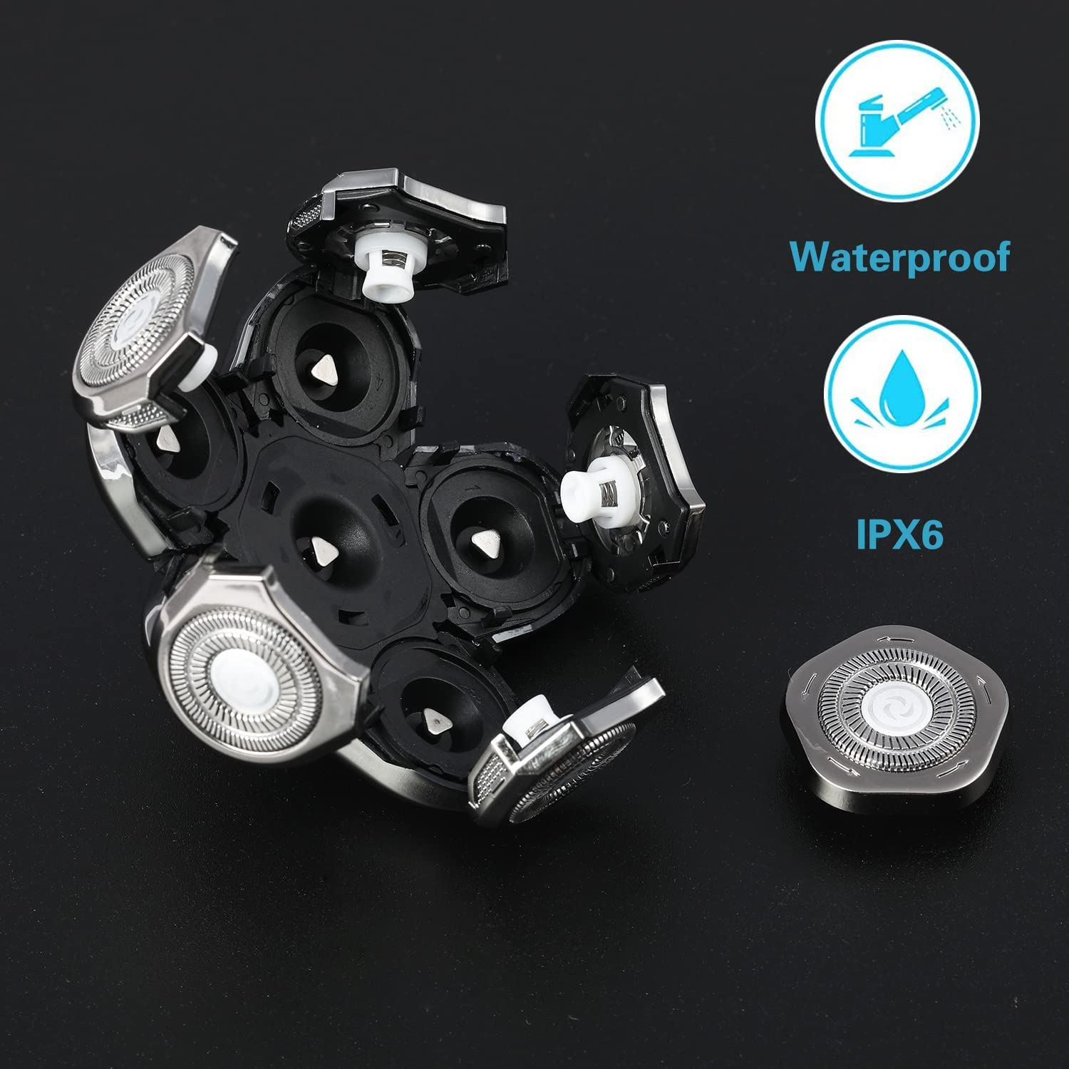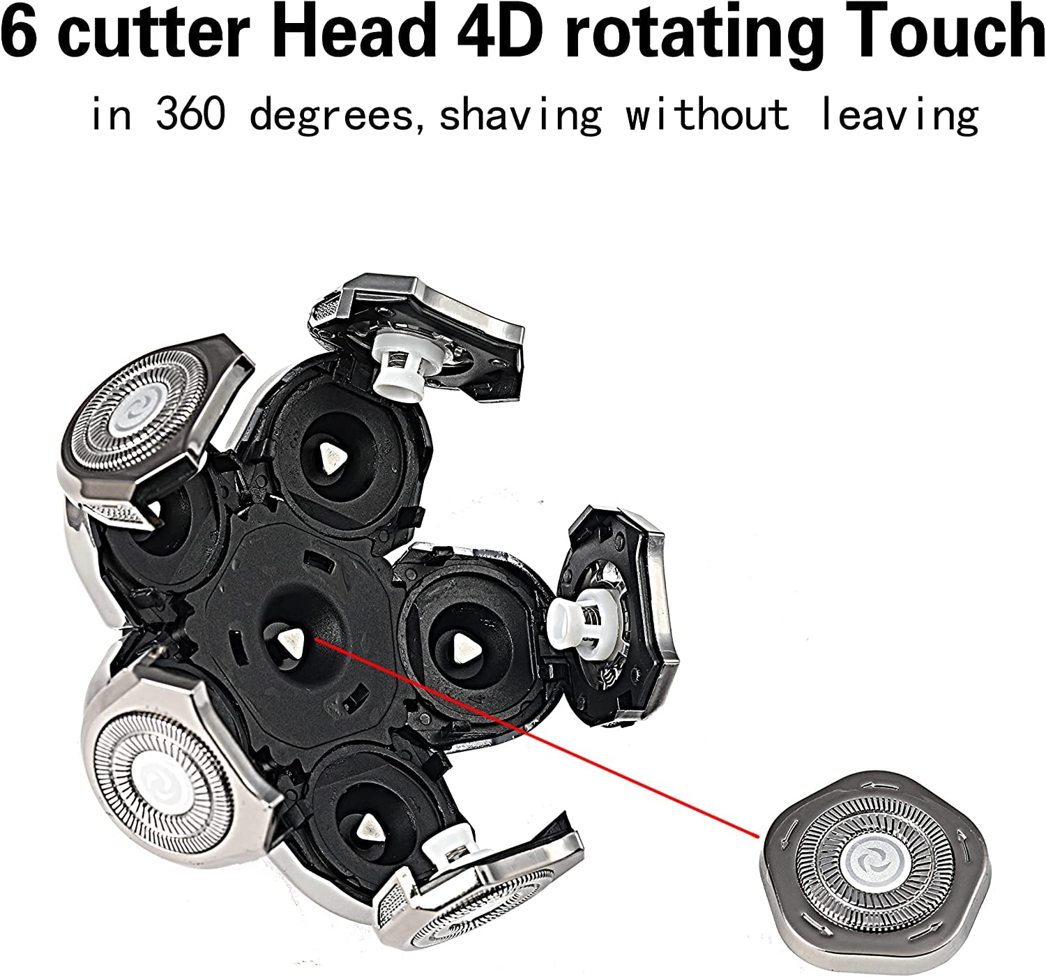 - COMFORTABLE SHAVING EXPERIENCE: Men's electric razor replacement head with 6 blade heads, double ring anti-allergy stainless steel blades. Its 6d flex floating head rotates to follow the contours of your face, head, neck and chin, providing a closer and cleaner trim without irritating the skin. With self-sharpening technology, it won't pull out your beard while shaving, giving you a fast and comfortable shaving experience.