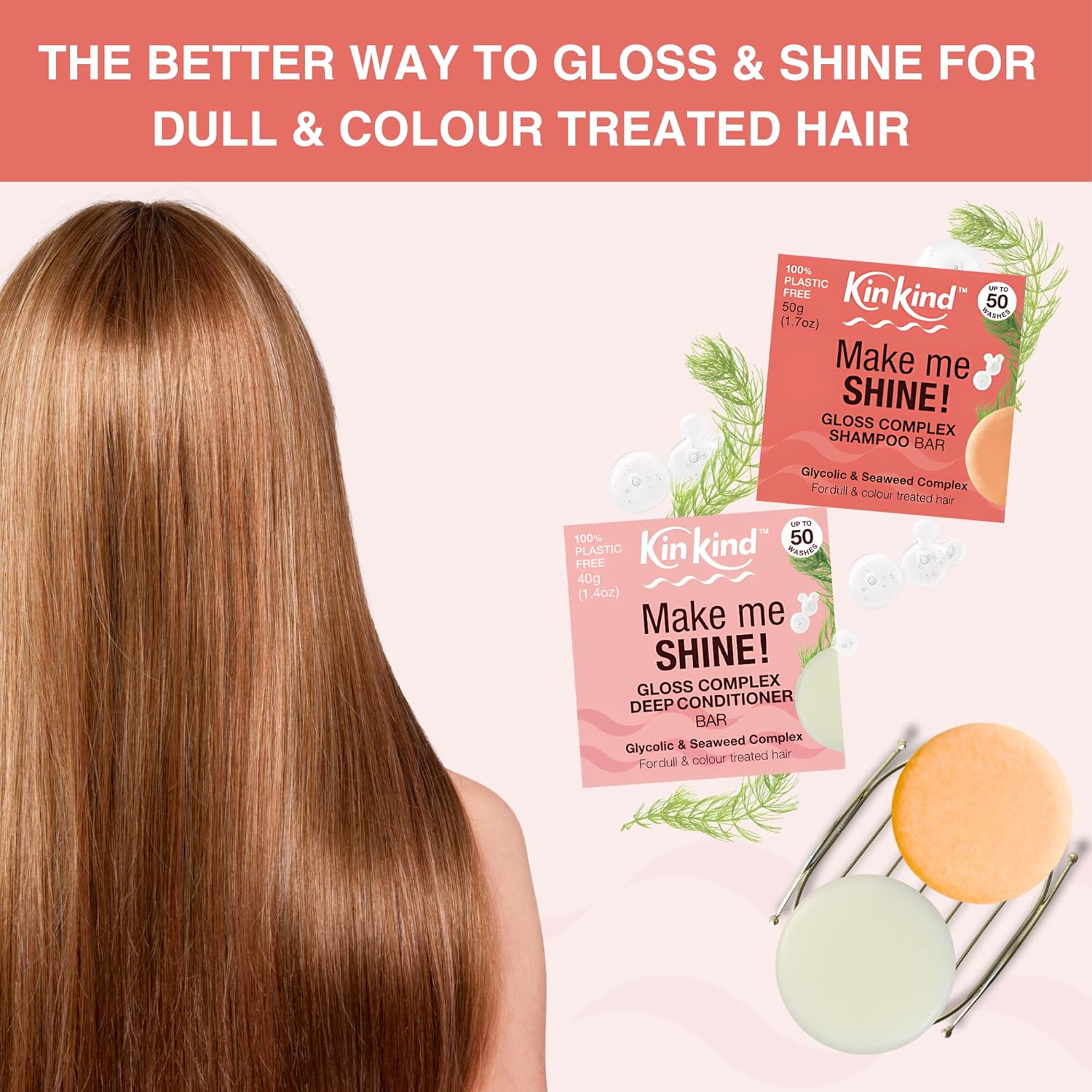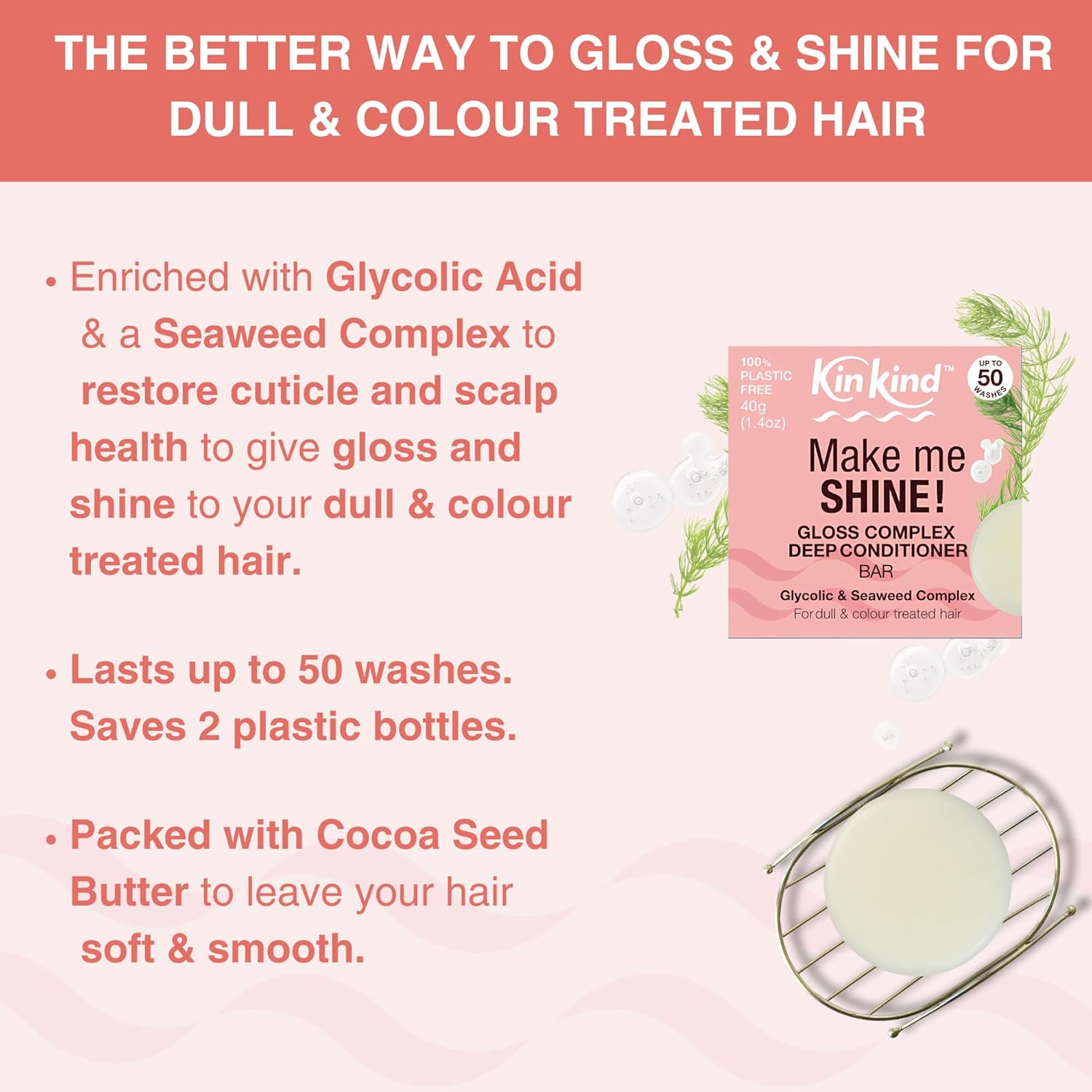- GLYCOLIC ACID & SEAWEED GLOSS COMPLEX: Our Make me SHINE! deep hair conditioner bar is enriched with a dreamy blend of Glycolic Acid & a Seaweed Gloss Complex that restores cuticle and scalp health, and strengthen bonds often damaged through colour-treatments & heat styling to give you glossier, softer, smoother hair.