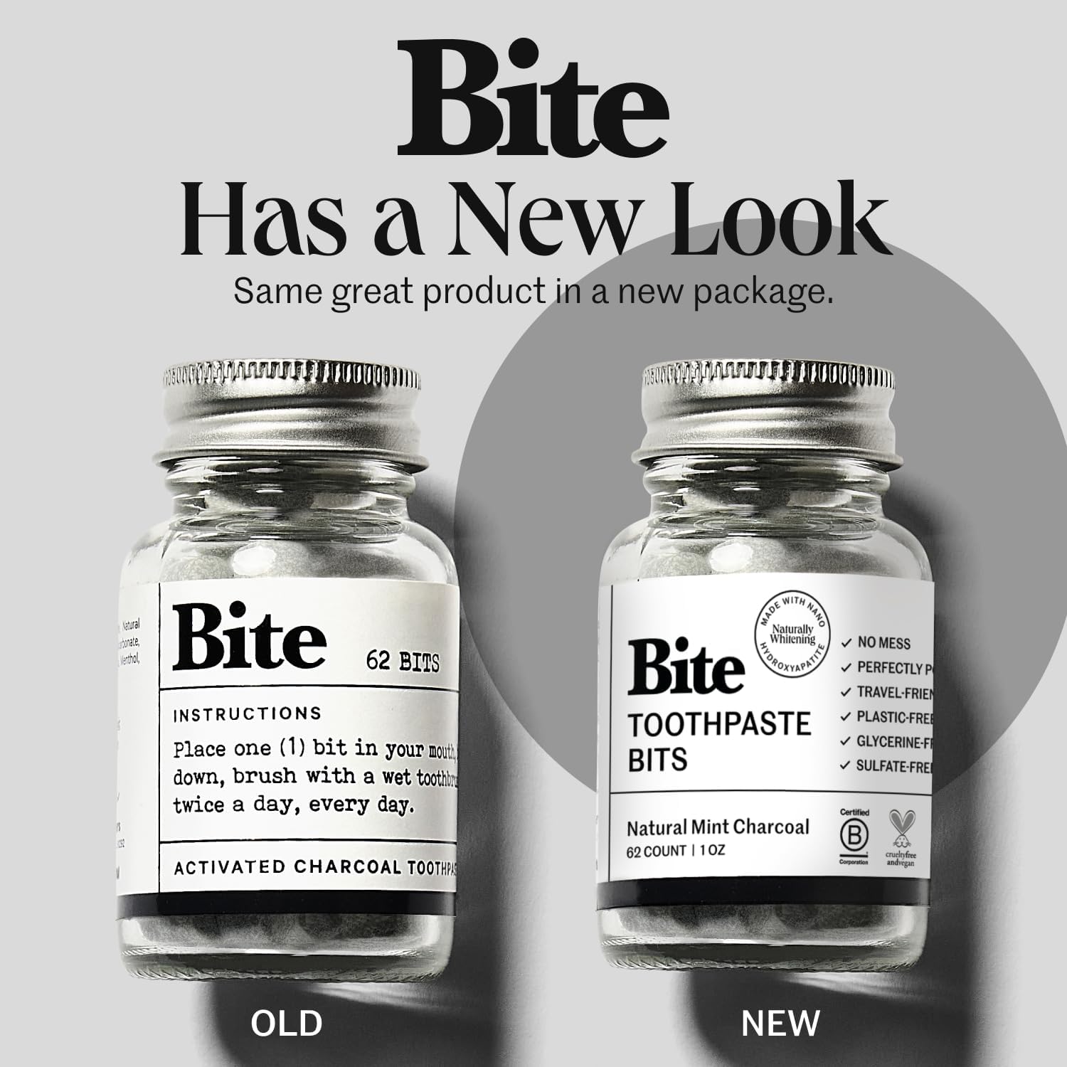 Bite Whitening Toothpaste Tablets – Nano Hydroxyapatite & Xylitol (Mint Charcoal) | Sensitive Teeth Friendly | No Fluoride, Vegan, Cruelty-Free | Travel-Size | 2 Bottles (124 Bits) | Made in USA