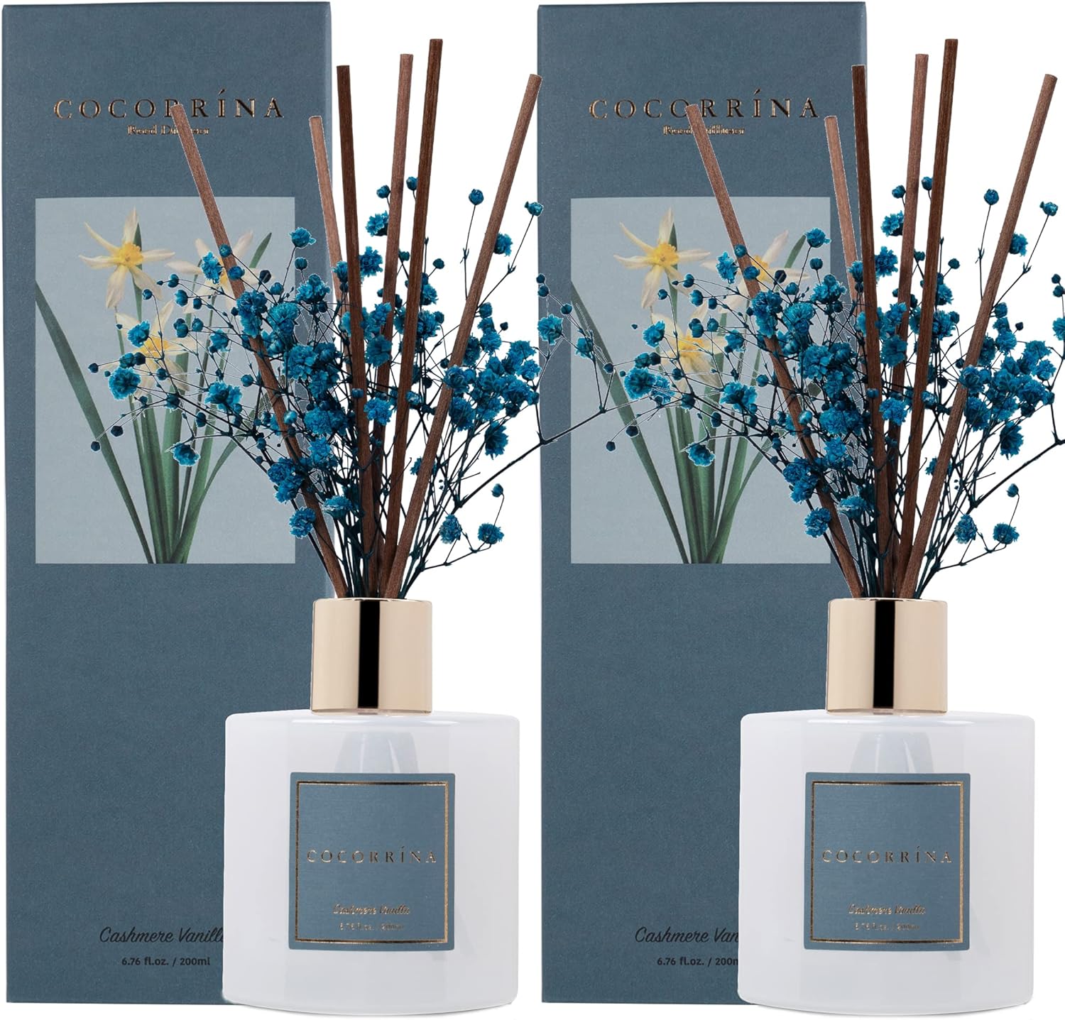 Cocorrína Premium Reed Diffuser Set with Preserved Baby's Breath & Cotton Stick Cashmere Vanilla 2 Packs, 6.7oz Scent Fragrance Oil Diffuser for Bedroom Bathroom Home Décor