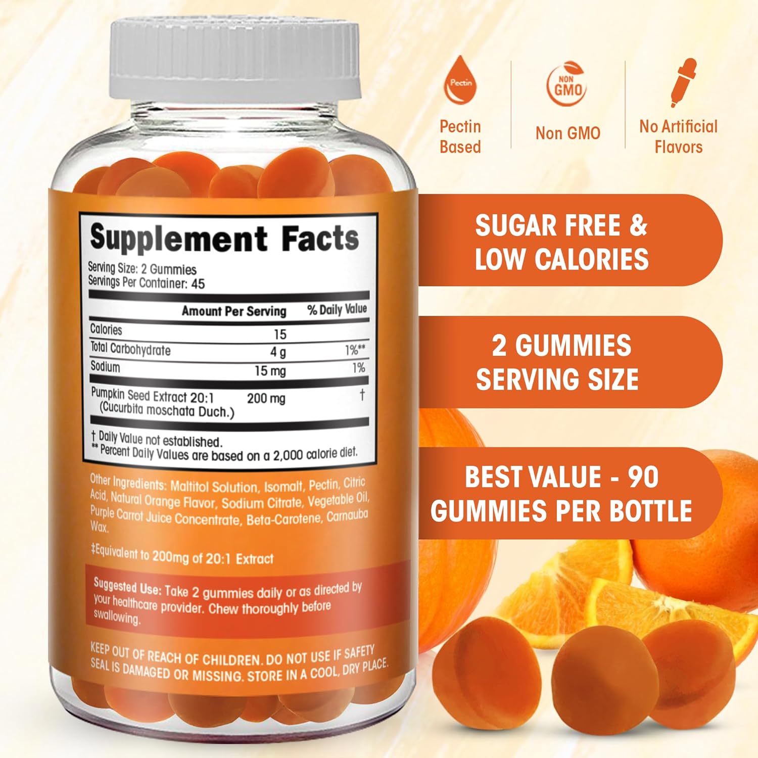 - Best value and sugar free! Each bottle is packed with 90 SUGAR FREE gummies that you can eat completely guilt free. A delicious orange flavored snack that you can feel good about.