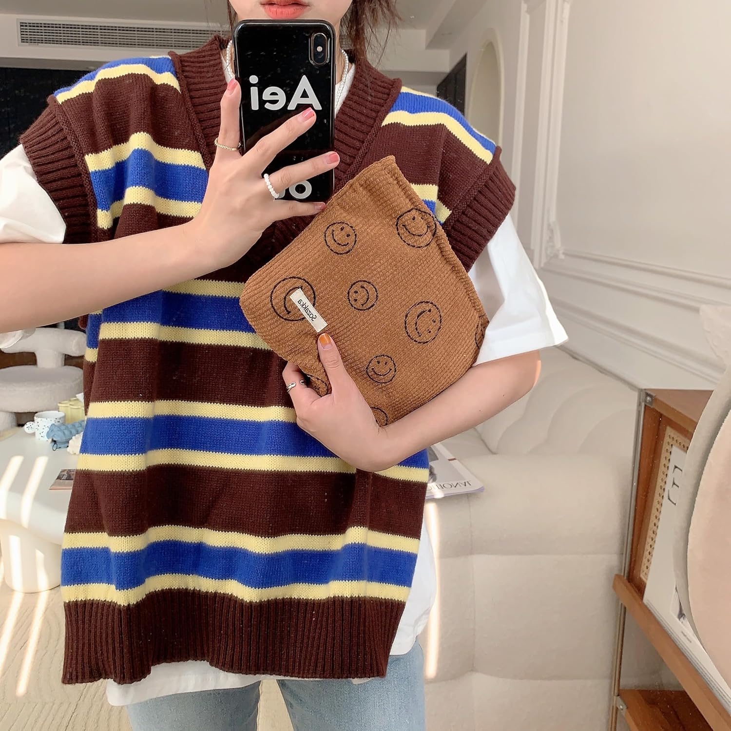 Cosmetic Bags for Women - Corduroy Cosmetic Bag Aesthetic Women Handbags Purses Smile Dots Makeup Organizer Storage Makeup Bag Girls Case Bags (A-Brown)