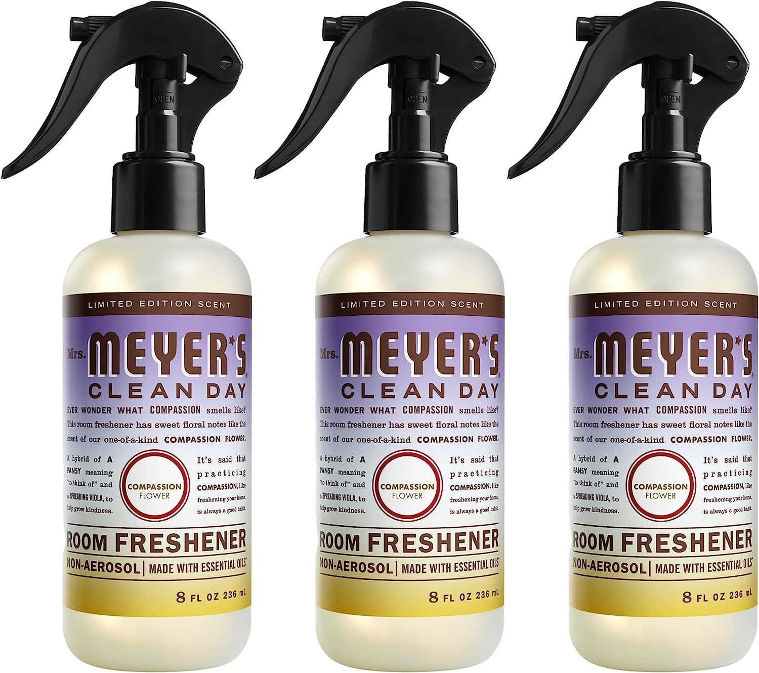 - Mrs. Meyer’s Clean Day Compassion Flower air freshener spray is made with essential oils and other thoughtfully chosen ingredients, and gives your home instant freshening between cleaning days
